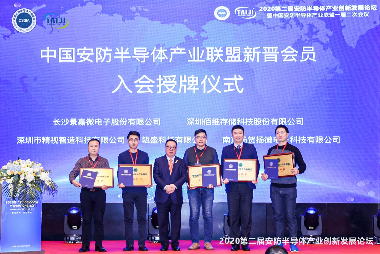 會議尾聲,還舉行了中國安防半導(dǎo)體產(chǎn)業(yè)聯(lián)盟新晉會員單位入會授牌儀式。深圳佰維存儲科技股份有限公司、長沙景嘉微電子股份有限公司榮膺聯(lián)盟理事單位,瓴盛科技有限公司、深圳市精視智造科技有限公司,南京揚賀揚微電子科技有限公司榮膺聯(lián)盟會員單位。中國安防半導(dǎo)體產(chǎn)業(yè)聯(lián)盟主席楊金才為以上單位進(jìn)行授牌。