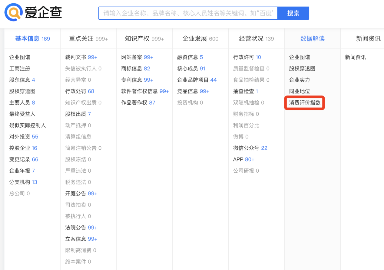 “愛企查”企業(yè)消費評價指數(shù)查詢流程: