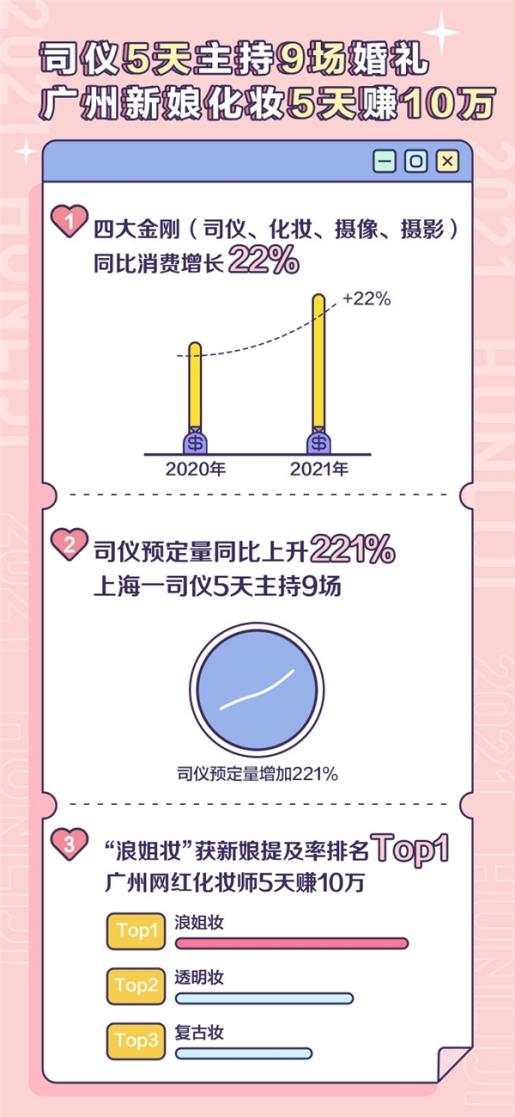 “快要忙瘋了,五一5天辦了150多場(chǎng)婚禮,第一天就有60場(chǎng),去年這時(shí)候婚禮只有個(gè)位數(shù),今年我們員工都加班加點(diǎn)連夜趕工搭建場(chǎng)地。”婚禮紀(jì)商家Sunny喜鋪婚禮副總趙佳佳在接受采訪的時(shí)候表示,不僅商家忙,新人也非常忙,Z世代的新人都習(xí)慣于通過線上咨詢、直播下單等互聯(lián)網(wǎng)形式進(jìn)行婚禮消費(fèi),省去了線下奔波的時(shí)間。
