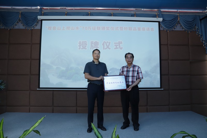 同時,經(jīng)中國楹聯(lián)學(xué)會研究決定,授予廣東觀音山國家森林公園“中國楹聯(lián)文化名山”榮譽(yù)稱號。中國楹聯(lián)學(xué)會顧問委員會副主任、中國楹聯(lián)學(xué)會原副會長、鄒繼海代表中國楹聯(lián)學(xué)會,為廣東觀音山國家森林公園授牌。