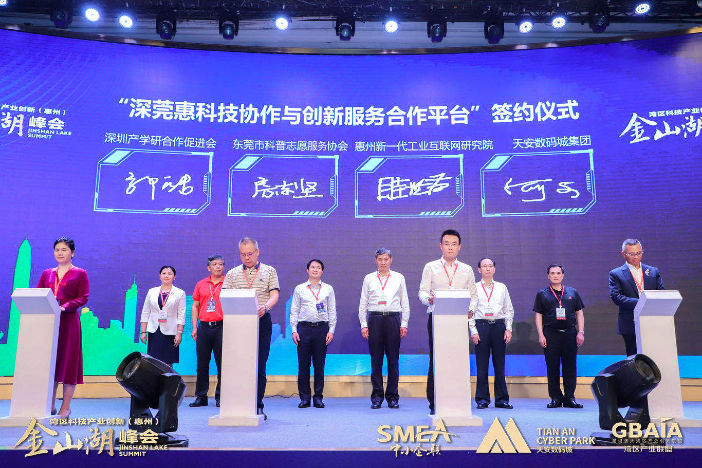昨日,由深圳市中小企業(yè)產(chǎn)業(yè)創(chuàng)新協(xié)會(huì)、天安數(shù)碼城集團(tuán)聯(lián)合主辦的“雙區(qū)驅(qū)動(dòng)·深度融灣”2021首屆灣區(qū)科技產(chǎn)業(yè)創(chuàng)新(惠州)金山湖峰會(huì)在惠州市惠城區(qū)康帝國(guó)際酒店如期舉行。本次峰會(huì)得到了惠州市惠城區(qū)人民政府、惠州市工業(yè)和信息化局、惠州市商務(wù)局、惠州市科學(xué)技術(shù)局、惠州市科學(xué)技術(shù)協(xié)會(huì)、香港貿(mào)易發(fā)展局、澳門貿(mào)易投資促進(jìn)局、香港生產(chǎn)力促進(jìn)局深圳創(chuàng)新及技術(shù)中心的大力支持。出席本屆峰會(huì)的嘉賓包含政府部門領(lǐng)導(dǎo)、上市公司董事長(zhǎng)、大灣區(qū)各行業(yè)領(lǐng)域龍頭企業(yè)負(fù)責(zé)人、專家學(xué)者、專業(yè)聽眾等超500余人,一同見證了“深莞惠科技協(xié)作與創(chuàng)新服務(wù)合作平臺(tái)”簽約以及《灣區(qū)產(chǎn)業(yè)聯(lián)盟(惠州)科技創(chuàng)新展示中心》的正式啟動(dòng)。