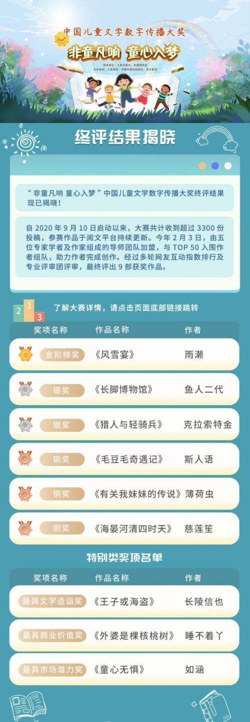 深圳新聞網(wǎng)2021年6月1日訊“非童凡響童心入夢”中國兒童文學(xué)數(shù)字傳播大獎(jiǎng)6月1日揭曉終評(píng)結(jié)果,《風(fēng)雪宴》等9部參賽作品從3300余部作品中脫穎而出。大獎(jiǎng)終評(píng)頁面已在人民日報(bào)數(shù)字傳播有限公司旗下“人民閱讀”平臺(tái)、中國中福會(huì)出版社、閱文集團(tuán)等平臺(tái)全面上線。