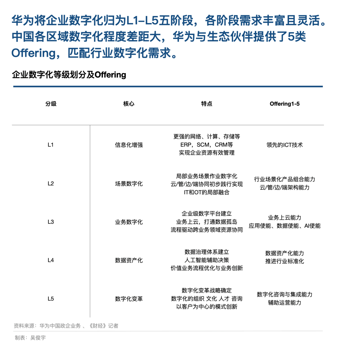 應(yīng)對每個階段的數(shù)字化挑戰(zhàn),需要提供可靈活搭配的能力,其中可能涉及ICT技術(shù)這類L1級能力,也可能涉及數(shù)字化咨詢、集成、輔助運營這類L5級能力。為此,華為攜手伙伴提供了5類Offering。