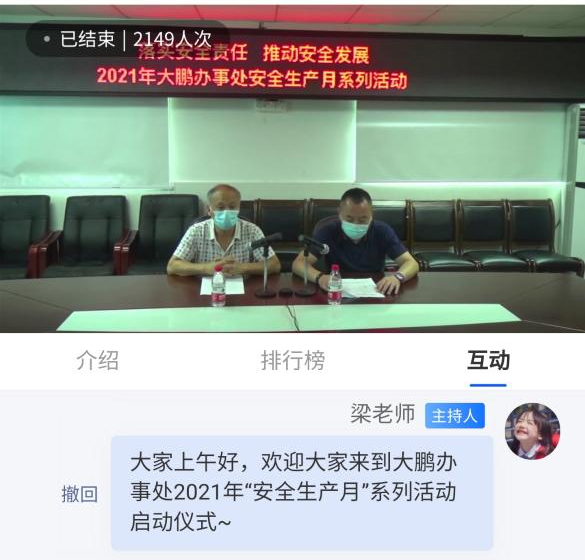 近日,大鵬辦事處組織開展了安全生產(chǎn)月系列活動,因疫情防控需要,此次啟動儀式采取線上直播的方式進行,轄區(qū)2100余名居民熱情參與“走進”會議現(xiàn)場,參與答題人數(shù)1750人,活動共計派發(fā)紅包635份。