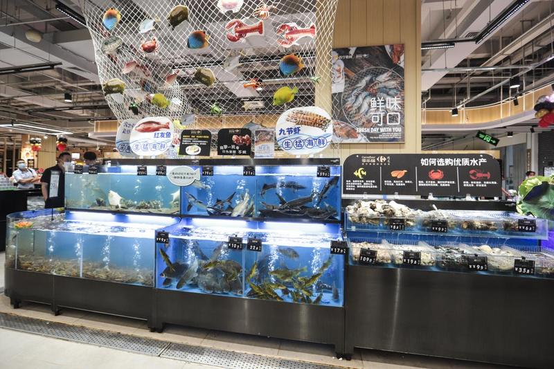 全新定位的家樂福最吸睛的當(dāng)屬店內(nèi)鮮活的海鮮。來自福建寧德、山東青島、浙江舟山、廣西北海、廣東珠海等地的鮮活生蠔、大閘蟹、基圍蝦、珍寶蟹、皮皮蝦、多寶魚等國產(chǎn)鮮活水產(chǎn),來自俄羅斯、英國、美國的帝王蟹、面包蟹、珍寶蟹等進口鮮活水產(chǎn),讓慕名而來的顧客直呼選擇恐懼癥要犯了!
