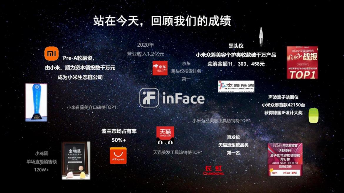 據(jù)了解, inFace創(chuàng)立于2017年6月21日,經(jīng)過近1年籌備,2018-2020年完成了第一個“三年計劃”,即實現(xiàn)成為行業(yè)有代表和開創(chuàng)性“產(chǎn)品型公司”的戰(zhàn)略目標(biāo)。在這期間,inFace發(fā)布原創(chuàng)產(chǎn)品12款+,年營收超1億元,同時完成由小米集團、順為資本領(lǐng)投的數(shù)千萬元Pre-A輪融資,正式加入小米生態(tài)鏈。在小米有品、天貓和京東等國內(nèi)主流電商平臺上,核心類目例如潔面儀、黑頭儀、直發(fā)梳、美膚儀和美容儀等產(chǎn)品,inFace都是TOP級商家。