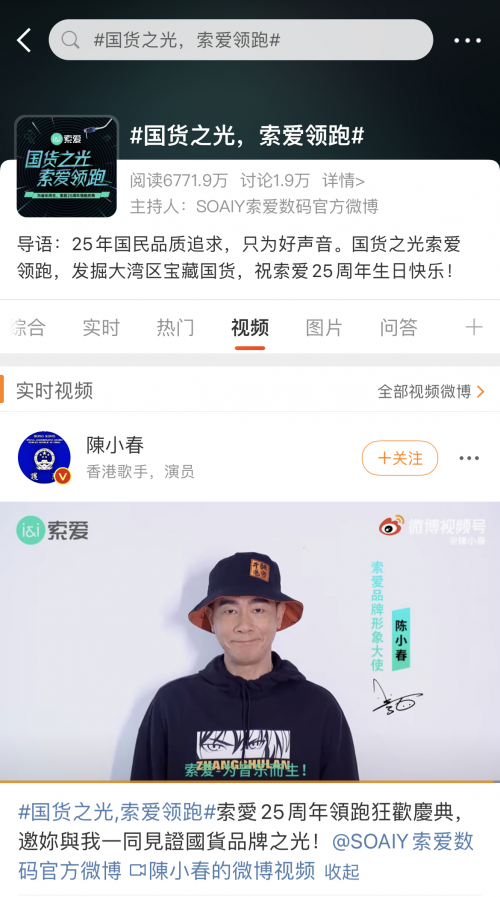 讀特客戶端·深圳新聞網(wǎng)2021年10月22日訊(記者 田志強(qiáng))近日,索愛(ài)廣州25周年慶領(lǐng)跑活動(dòng)在網(wǎng)絡(luò)持續(xù)發(fā)酵,引爆輿論熱烈關(guān)注。作為音頻數(shù)碼行業(yè)首個(gè)登錄廣州塔的國(guó)貨品牌,索愛(ài)25周年領(lǐng)跑活動(dòng)吸引了大量的媒體和達(dá)人齊聚廣州塔,索愛(ài)品牌和產(chǎn)品熱度以廣州為中心迅速向周邊地域傳播。在索愛(ài)冠名高鐵、簽約陳小春夫婦為品牌形象大使等品牌事件的疊加聚合效應(yīng)下,#國(guó)貨之光,索愛(ài)領(lǐng)跑#等話題和熱度持續(xù)傳播至各社交平臺(tái),各個(gè)類別KOL相繼為索愛(ài)發(fā)聲,僅在微博平臺(tái)的話題閱讀量已突破數(shù)千萬(wàn)。