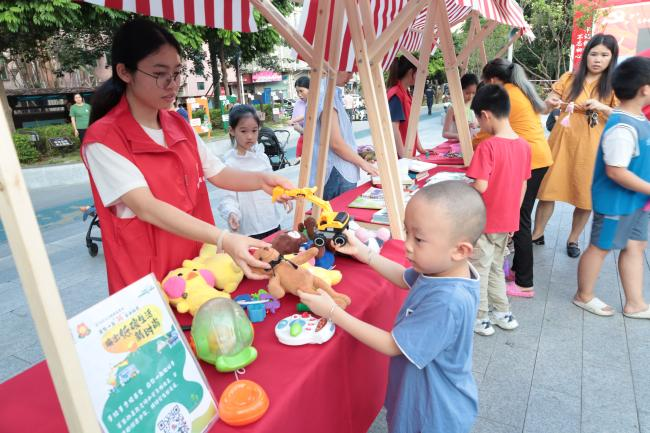 活動現(xiàn)場設(shè)有“換享游戲區(qū)”“換享市集區(qū)”“換享留影區(qū)”“換享觀影區(qū)”四大區(qū)域,吸引了200余名社區(qū)居民、志愿者、小朋友共同參與,發(fā)放《條例》手冊和宣傳資料250余份。