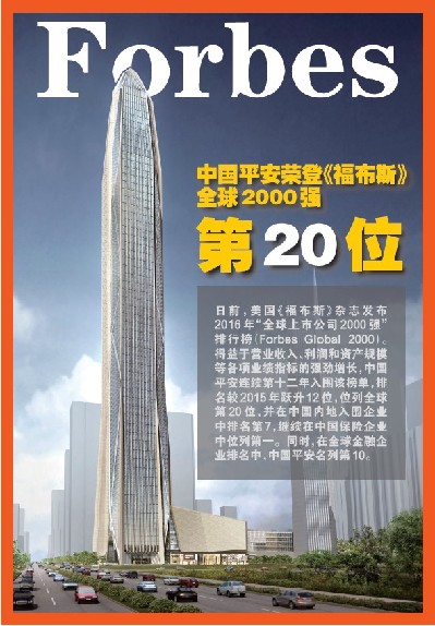 中國平安保險(集團)股份有限公司連續(xù)第十二年入圍全球上市公司2000強,排名較2015年躍升12位,位列全球第20位。