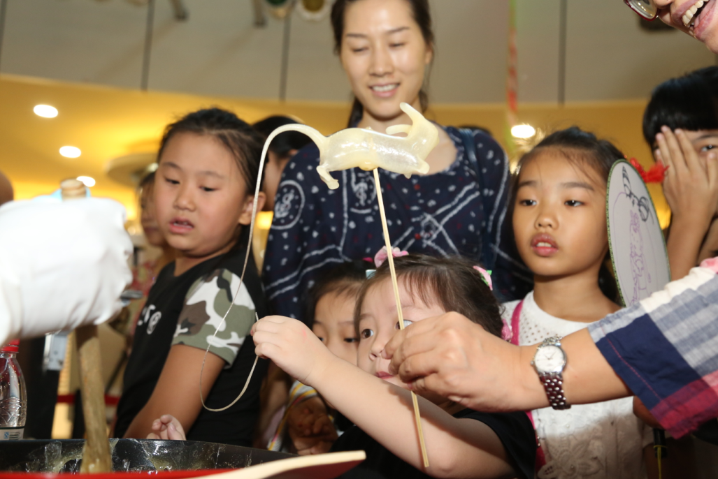 現(xiàn)場(chǎng),糖人制作師傅安靜地坐在展臺(tái)前,任人群在身邊走走停停,埋頭專注捏著各式形狀。只見(jiàn)他用竹篾緩緩攪拌麥芽糖,挖出一團(tuán)放在手里揉捏拉扯,做出一個(gè)小管子,抿嘴往里吹氣,麥芽糖慢慢膨脹并逐漸變成透明,再迅速捏出頭和腳,一只糖老鼠便活靈活現(xiàn)地被“吹”了出來(lái)?!疤衿媪?,麥芽糖在叔叔手中變成了‘活’的,沒(méi)想到傳統(tǒng)手工藝如此出神入化?!?0歲的玥玥瞧得津津有味,她說(shuō),比起逛商場(chǎng)和游樂(lè)場(chǎng),這樣的體驗(yàn)活動(dòng)不僅能感受到中華傳統(tǒng)文化,還可以學(xué)到很多課本以外的知識(shí)。
