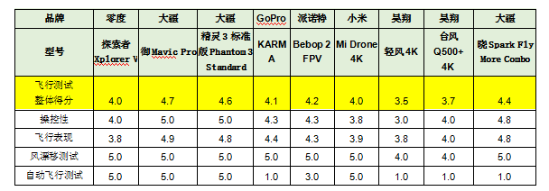 自動飛行測試:零度“探索者Xplorer V”、大疆的“御Mavic Pro”、“精靈3標準版Phantom 3 Standard”,小米“Mi Drone 4K”4款無人機獲滿分