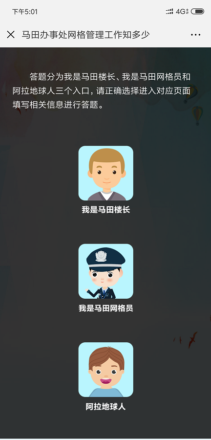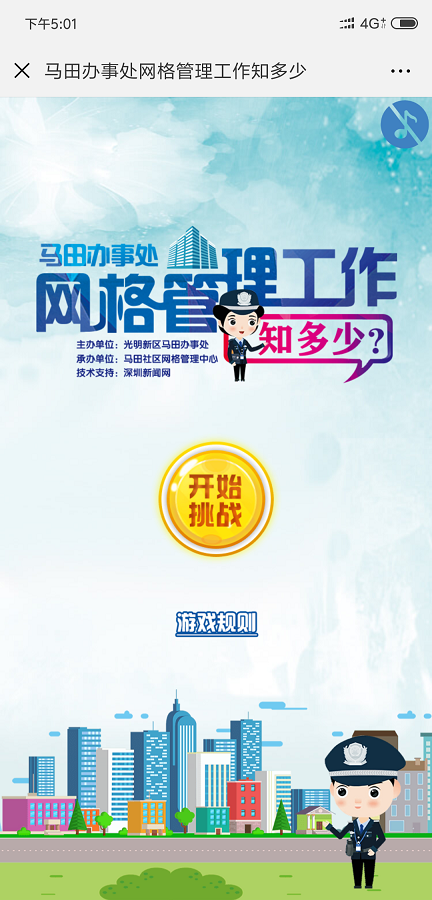 隨著當(dāng)前光明新區(qū)經(jīng)濟(jì)和社會(huì)的飛速發(fā)展,網(wǎng)格巡查管理工作環(huán)境日趨復(fù)雜。為此,馬田辦事處以社區(qū)網(wǎng)格化為抓手,積極帶領(lǐng)業(yè)主、樓長(zhǎng)、住戶主動(dòng)參與到樓棟的管理和社區(qū)的建設(shè),使他們從小“家”邁向大“家”,家家參與、人人行動(dòng),讓安全文明新風(fēng)形成常態(tài),營(yíng)造生機(jī)勃勃、欣欣向榮的社會(huì)氛圍,在馬田轄區(qū)打造共建共治共享社會(huì)治理格局?!榜R田辦事處網(wǎng)格管理工作知多少”線上有獎(jiǎng)競(jìng)答活動(dòng),由光明新區(qū)馬田辦事處主辦,馬田社區(qū)網(wǎng)格管理中心承辦。此次答題活動(dòng)自8月15日9點(diǎn)啟動(dòng),截止至8月19日23點(diǎn)59分,為期5天。答題分為“我是網(wǎng)格員”入口、“我是樓長(zhǎng)”入口和“阿拉地球人”三個(gè)入口。通過(guò)樓長(zhǎng)入口進(jìn)入的用戶,需輸入馬田轄區(qū)樓長(zhǎng)身份證或港澳通行證號(hào)方可答題,網(wǎng)格員入口則需輸入馬田轄區(qū)網(wǎng)格員有效證件號(hào)碼進(jìn)入對(duì)應(yīng)的答題頁(yè)面。在每次答題時(shí),答題系統(tǒng)將隨機(jī)抽取10道題,用戶須在120秒的時(shí)間內(nèi)完成,答對(duì)8題以上即視為闖關(guān)成功,可獲得一次抽獎(jiǎng)機(jī)會(huì),有機(jī)會(huì)獲得100元、50元、10元、5元、2元不等的微信紅包。