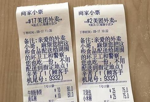愛心外賣訂單顯示,該訂單沒有收件人及地址。但下單人何女士留言備注稱,“親愛的外賣小哥,麻煩您把這些食品配送給周圍的環(huán)衛(wèi)工和警察,您也吃一份,不用配送到指定地點!辛苦了!”