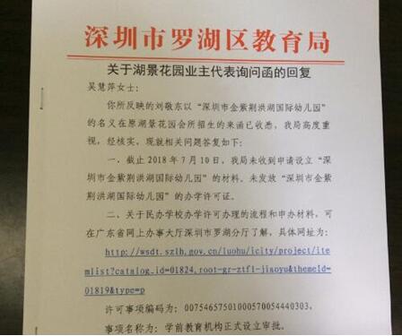 6月16日,市民在深圳論壇以《舉報(bào)湖景花園會(huì)所開(kāi)辦幼兒早教班違法招生》為題發(fā)帖反映,羅湖區(qū)湖景花園第四屆業(yè)主委員會(huì)于2018年7月曾去函羅湖區(qū)教育局,詢問(wèn)“深圳金紫荊洪湖國(guó)際幼兒園”是否具備招生資格。教育局明確回復(fù):未收到該幼兒園的申請(qǐng)資料,也未發(fā)放該園的辦學(xué)許可。