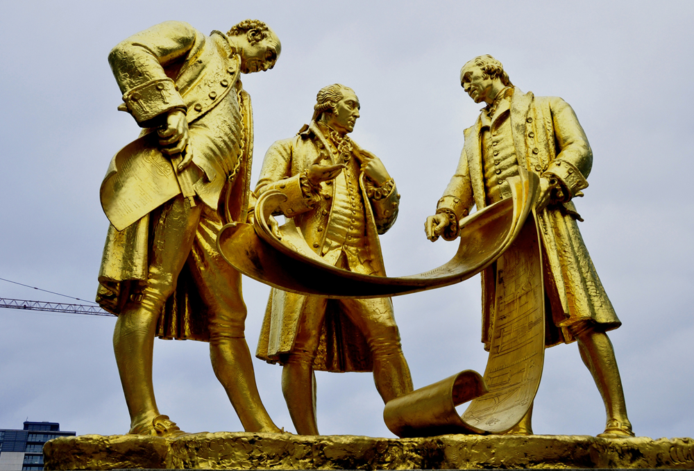 伯明翰是工業(yè)革命的發(fā)源地,市區(qū)會展中心對面有一座代表城市形象的雕塑作品,三個鎦金人物的塑像并肩佇立,正在討論問題,其金燦燦外表十分搶眼。這三個塑像是英國工業(yè)革命時期的杰出人物,蒸汽機(jī)的發(fā)明和制造者瓦特,蒸汽機(jī)和煤氣街燈的發(fā)明者默克多,工業(yè)家和機(jī)械制造商馬修·博爾頓。李仁奇 攝