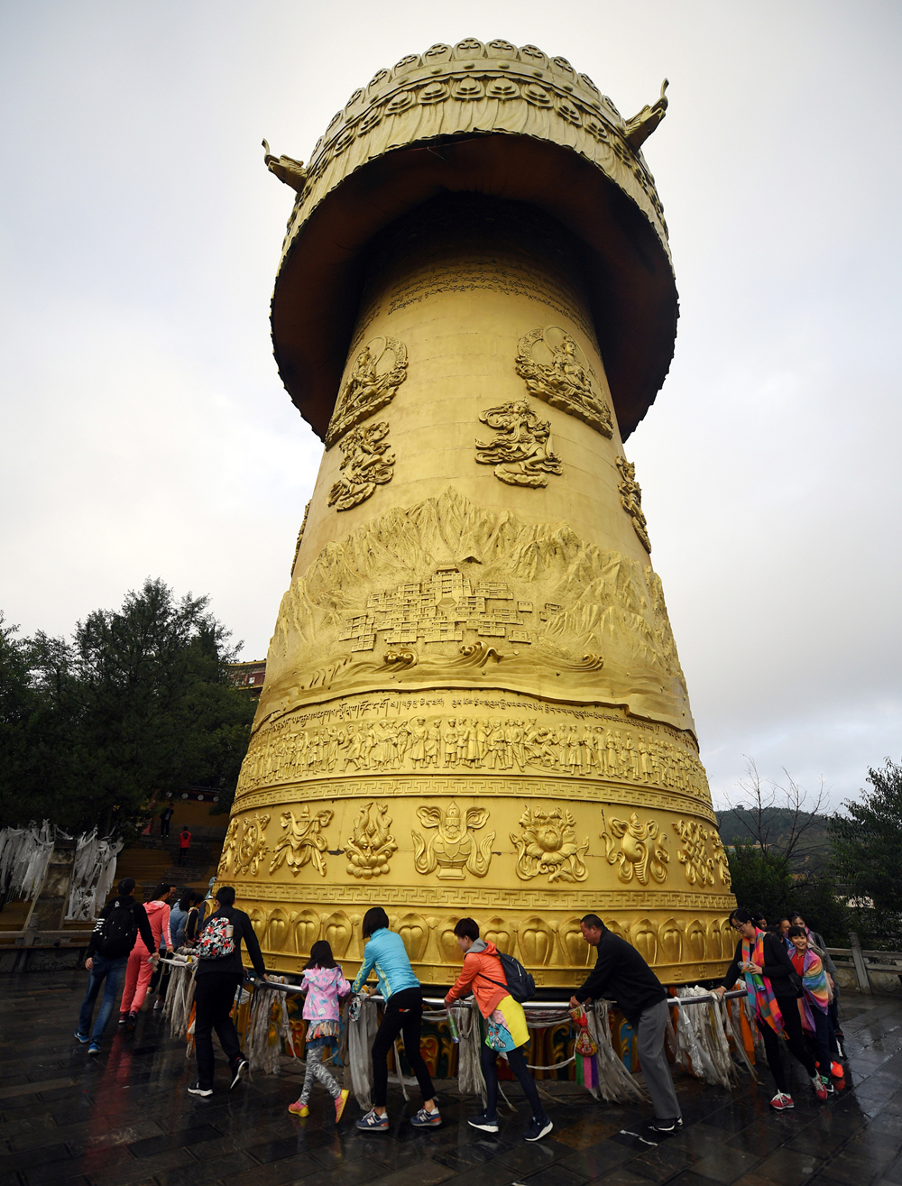 甘肅甘南藏族自治州瑪曲縣的寧瑪寺大藏經(jīng)轉(zhuǎn)經(jīng)筒矗立在金碧輝煌的寺院建筑群里,總投資4500萬元,歷經(jīng)四年,于2018年建成。筒體浮雕由尼泊爾工匠使用60公斤黃金手工鍛鑄鎏金而成。轉(zhuǎn)經(jīng)筒自身重量達(dá)320噸,內(nèi)裝大藏經(jīng)1008部共11萬冊(cè)。李仁奇 攝