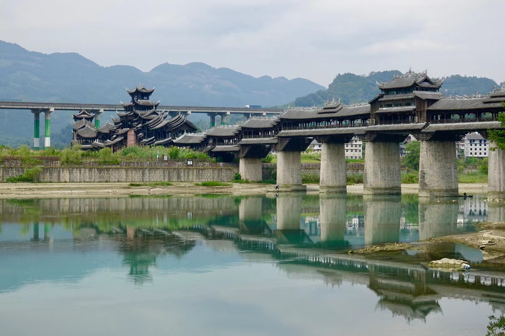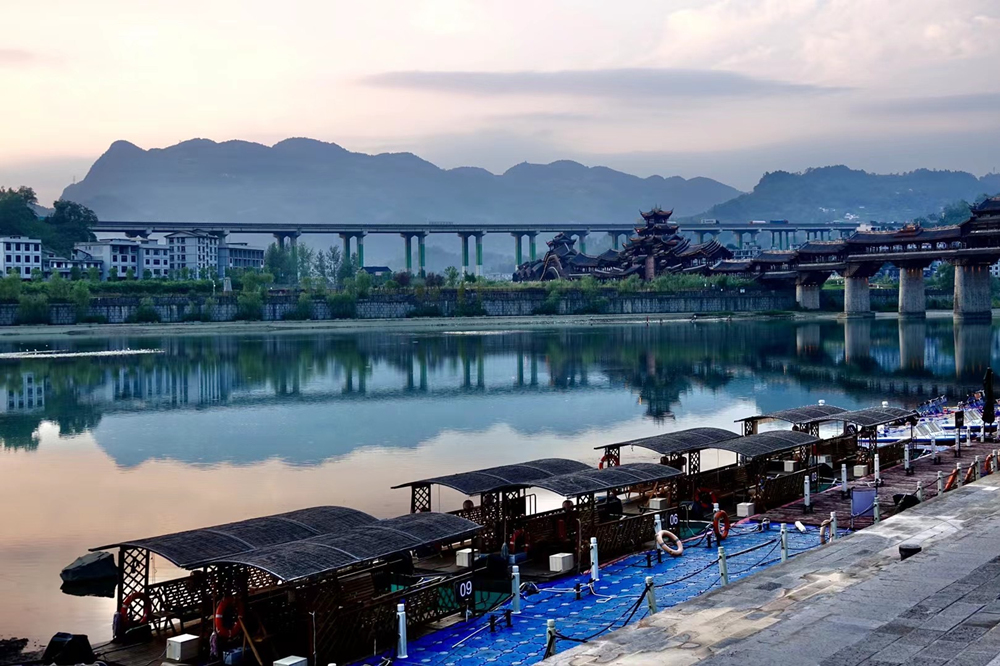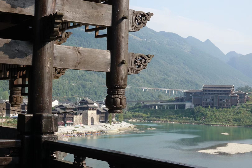 橫跨于濯水古鎮(zhèn)阿蓬江上的超長廊橋有“世界第一風(fēng)雨廊橋”之稱。李仁奇 攝