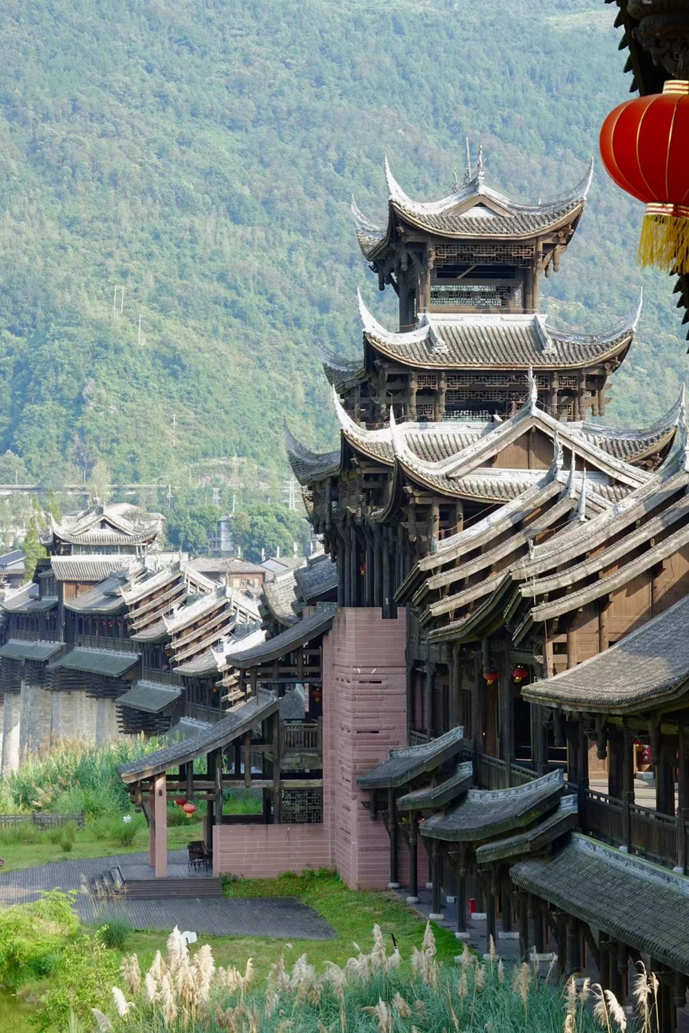 濯水廊橋長658米、寬5米,分為橋、塔、亭三部分,橋身為純木結(jié)構(gòu),建筑材料之間以榫頭卯眼互相穿插銜接,直套斜穿,牢固精密。李仁奇 攝