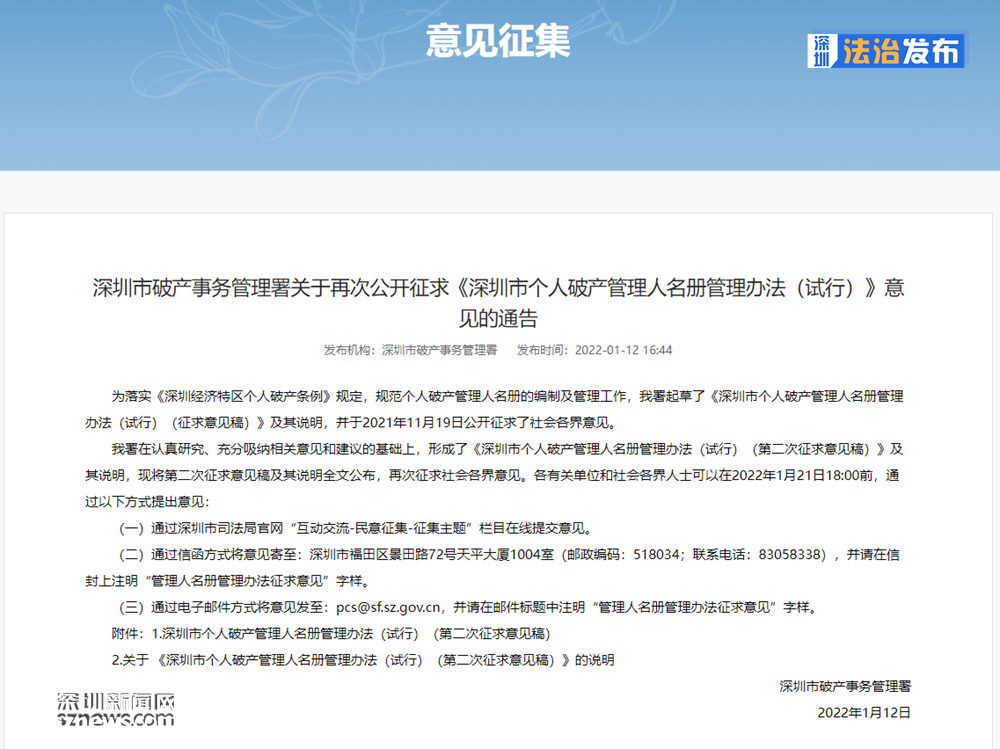 讀特客戶端?深圳新聞網(wǎng)2022年1月18日訊(記者 張玲)日前,深圳市破產(chǎn)事務(wù)管理署在深圳市司法局發(fā)布通告,面向社會(huì)征集《深圳市個(gè)人破產(chǎn)管理人名冊(cè)管理辦法(試行)》(以下簡(jiǎn)稱(chēng)管理辦法)的意見(jiàn),有意提交者可在2022年1月21日18時(shí)前提交。