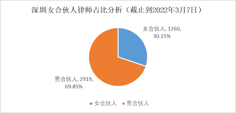 截至2022年3月7日,深圳律所共有注冊(cè)合伙人律師4179人,其中女合伙人律師1260人,占總合伙人數(shù)的30.15%。