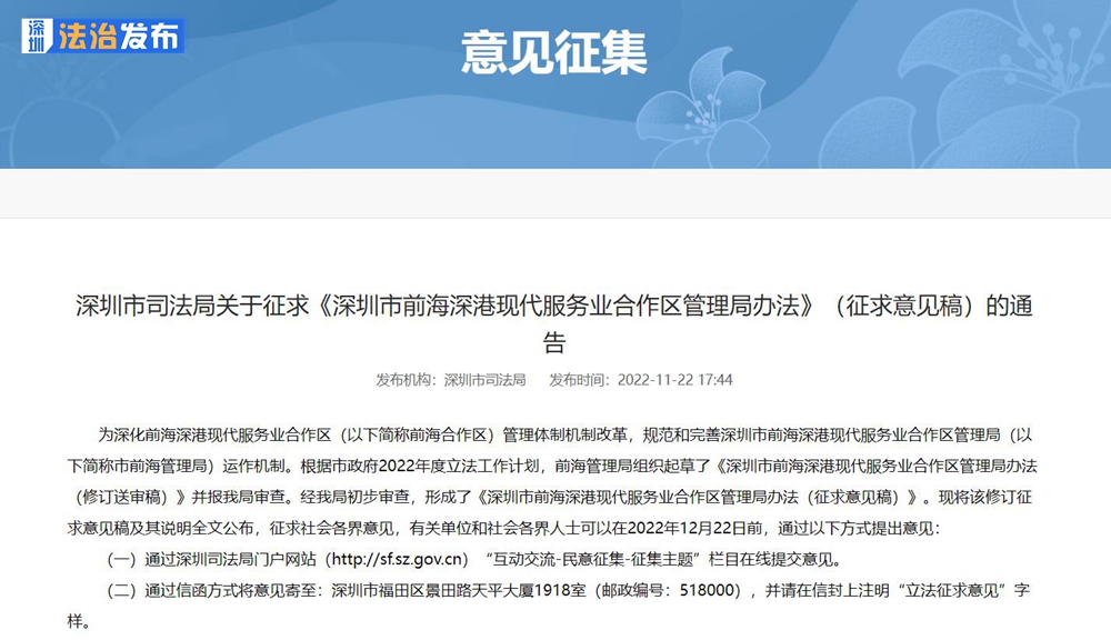 讀特客戶端·深圳新聞網(wǎng)2022年11月24日訊(記者 翁任瑩)近日,深圳市司法局發(fā)布《深圳市前海深港現(xiàn)代服務(wù)業(yè)合作區(qū)管理局辦法(征求意見(jiàn)稿)》(以下簡(jiǎn)稱《辦法》)及說(shuō)明全文,并向社會(huì)各界征求意見(jiàn)。