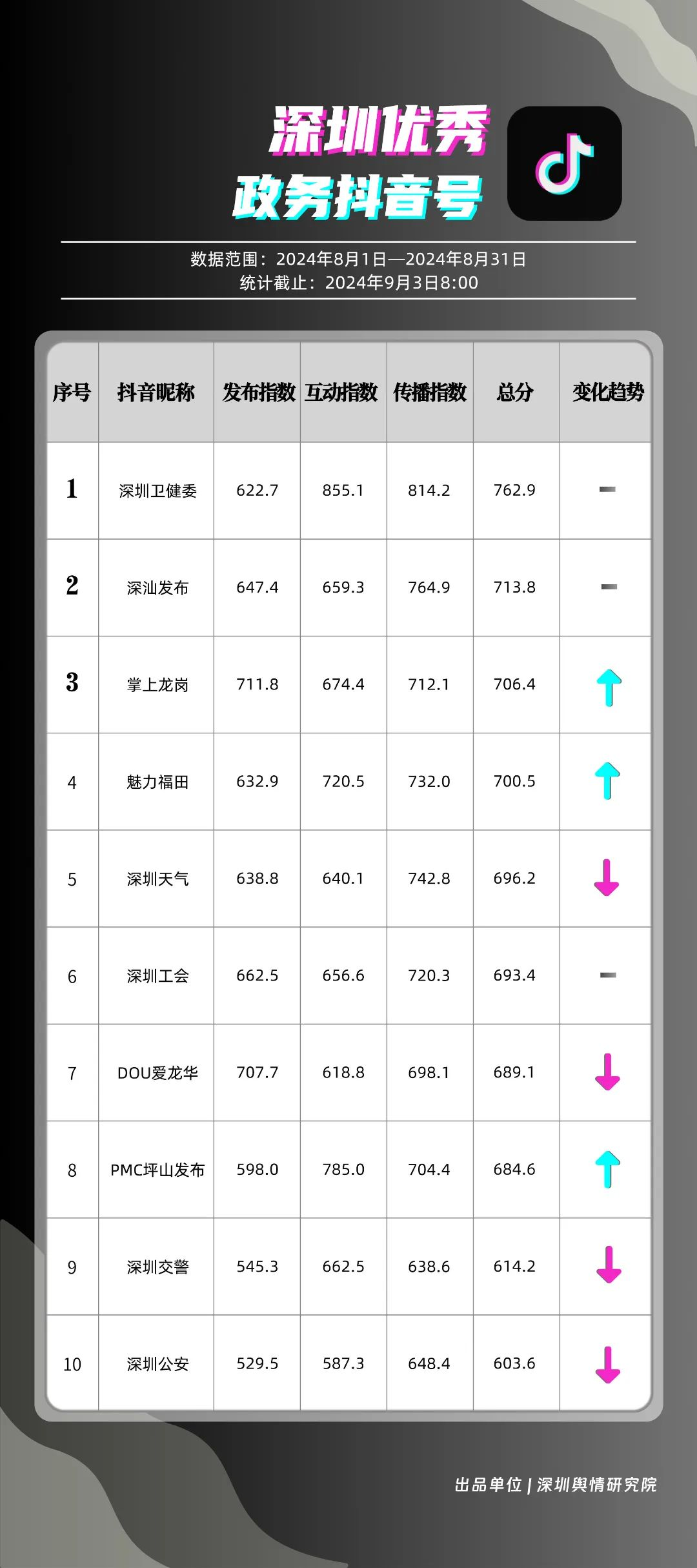 8月,“深圳衛(wèi)健委”“深汕發(fā)布”“掌上龍崗”“魅力福田”“深圳天氣”“深圳工會”“DOU愛龍華”“PMC坪山發(fā)布”“深圳交警”和“深圳公安”共10個政務(wù)抖音號獲得優(yōu)秀稱號,“深圳衛(wèi)健委”“深汕發(fā)布”“掌上龍崗”以高分居榜單前三,賬號有關(guān)“醫(yī)師節(jié)”“猴痘”“奧運(yùn)金牌”的視頻獲得了較高的關(guān)注度和討論度,相關(guān)優(yōu)秀視頻在傳播信息的同時,也展現(xiàn)了深圳政務(wù)抖音號在內(nèi)容質(zhì)量、互動性和傳播度方面的實(shí)力。