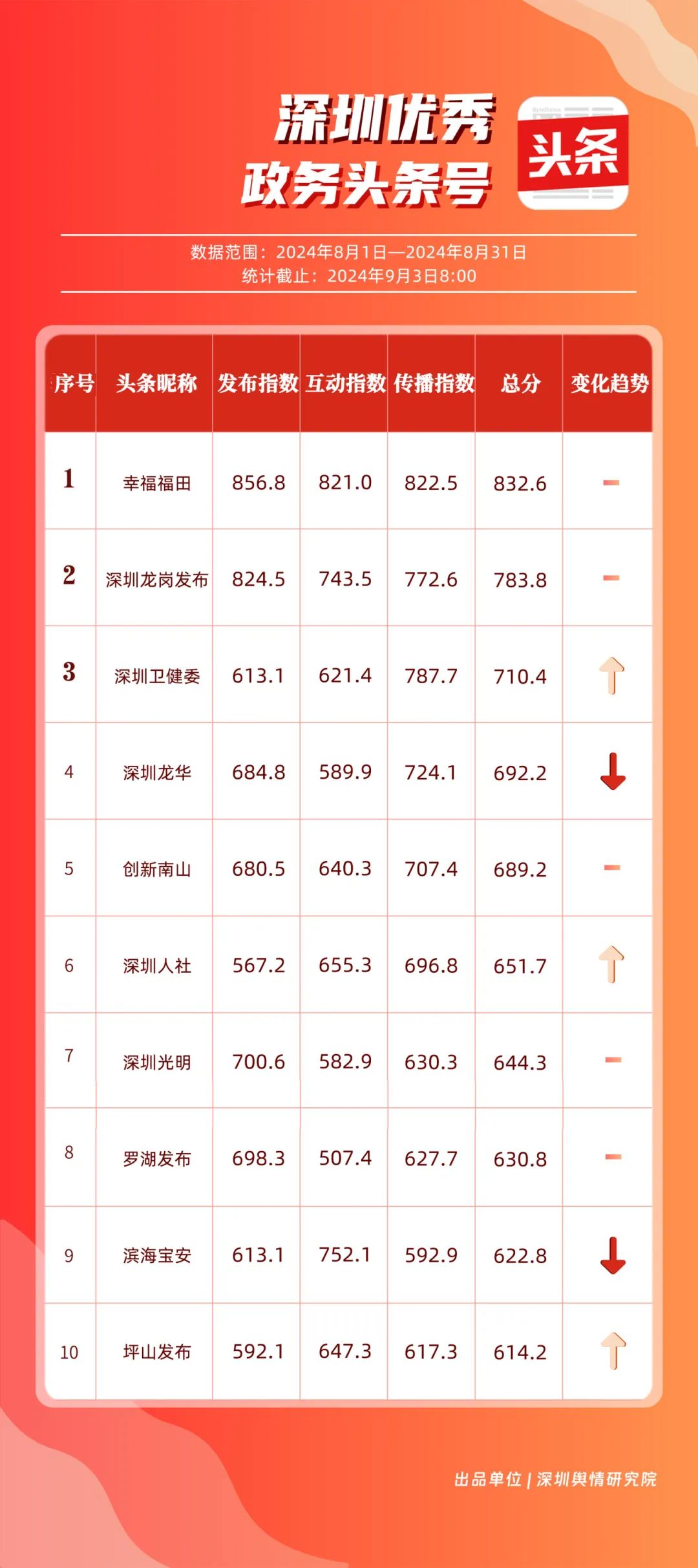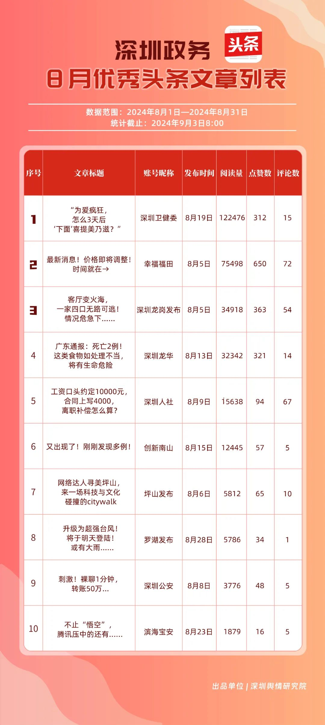 8月,“幸福福田”“深圳龍崗發(fā)布”“深圳衛(wèi)健委”“深圳龍華”“創(chuàng)新南山”“深圳人社”“深圳光明”“羅湖發(fā)布”“濱海寶安”和“坪山發(fā)布”共10個政務(wù)頭條號入選榜單。相關(guān)賬號的文章《“為愛瘋狂,怎么3天后‘下面’喜提美乃滋?”》《最新消息!價格即將調(diào)整!時間就在→》等貼近民生,傳遞實(shí)用信息,收獲了較高的閱讀量和點(diǎn)贊數(shù)。