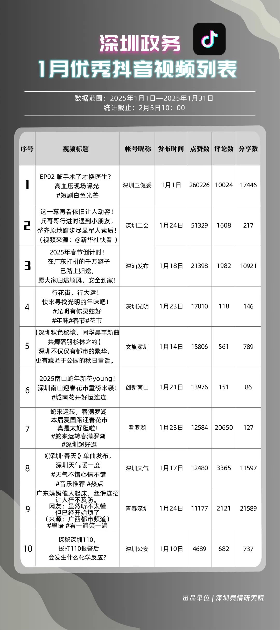1月,“深圳衛(wèi)健委”“深汕發(fā)布”“深圳天氣”“青春深圳”“看羅湖”“掌上龍崗”“深圳工會”“創(chuàng)新南山”“文旅深圳”“深圳公安”共10個政務(wù)抖音號獲得“深圳優(yōu)秀政務(wù)抖音號”稱號?!吧钲谛l(wèi)健委”“深汕發(fā)布”“深圳天氣”成績優(yōu)異,綜合實力較強,位于榜單前列。“青春深圳”“看羅湖”等賬號排名有所提升,彰顯了這些賬號在拓寬受眾基礎(chǔ)、增強用戶黏性等方面所取得的積極成效。