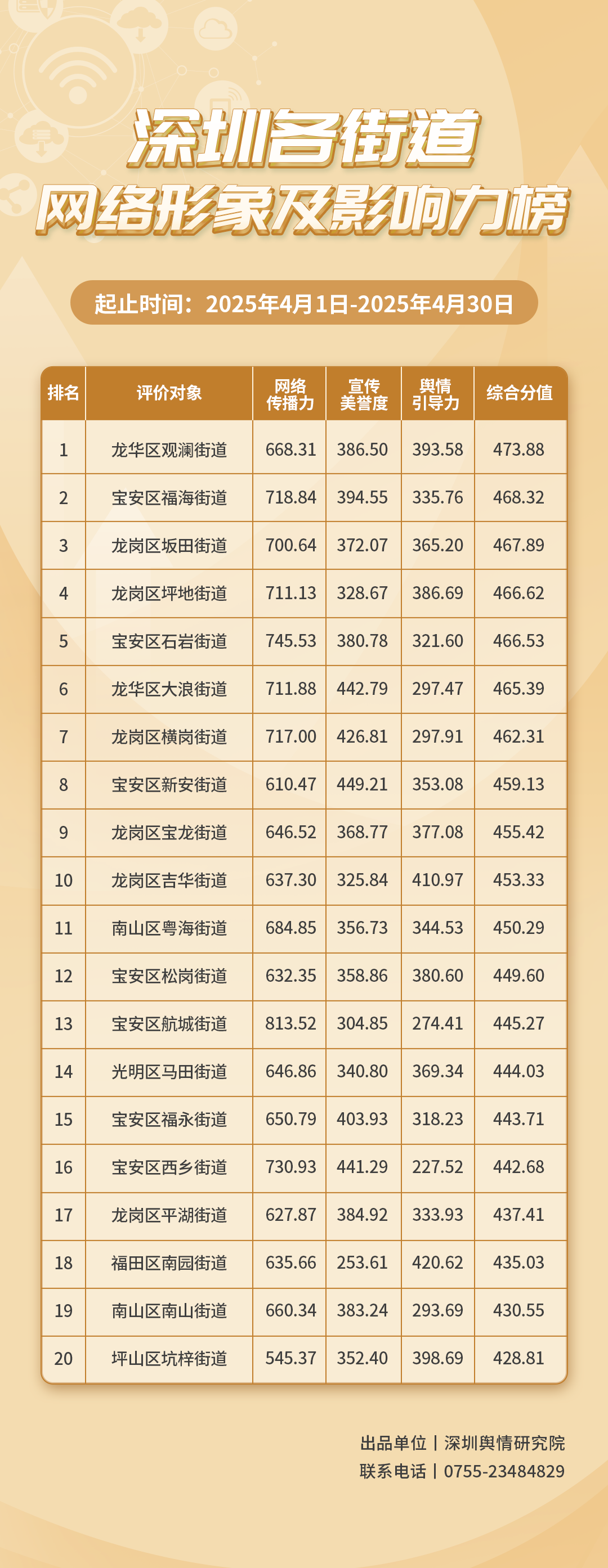 2025年4月,各街道立足網(wǎng)絡傳播新特點,持續(xù)深化網(wǎng)絡形象建設,以創(chuàng)新傳播賦能基層治理。《深圳各街道網(wǎng)絡形象及影響力榜》(4月榜單)評估街道在網(wǎng)絡空間的綜合表現(xiàn),為基層網(wǎng)絡形象治理提供參考。本期榜單數(shù)據(jù)統(tǒng)計范圍為2025年4月1日至4月30日。