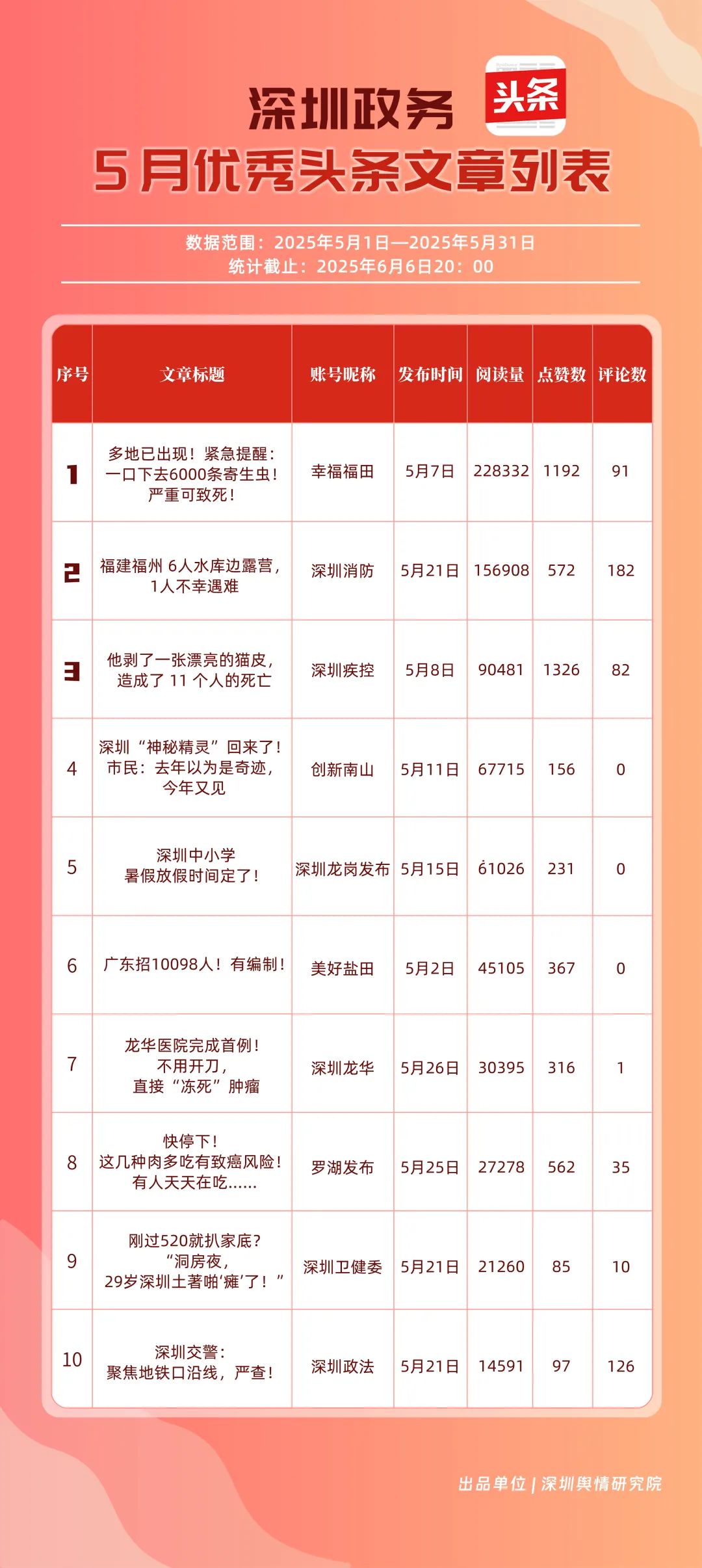 5月,“幸福福田”“深圳消防”“創(chuàng)新南山”“深圳疾控”“羅湖發(fā)布”“深圳龍崗發(fā)布”“坪山發(fā)布”“青春深圳”“深圳龍華”“深圳人社”共10個政務頭條號入選“優(yōu)秀政務頭條號”榜單。在榜單前三名中,“幸福福田”“創(chuàng)新南山”以穩(wěn)定且高質量的內(nèi)容輸出,持續(xù)領跑,排名較上個月未發(fā)生變動。位居榜單第二的“深圳消防”同樣表現(xiàn)亮眼,排名較上個月提升2個名次,充分展現(xiàn)了其在消防安全宣傳領域的持續(xù)深耕和創(chuàng)新突破。上榜政務頭條號各展所長,以優(yōu)質內(nèi)容為核心,充分發(fā)揮平臺傳播優(yōu)勢,為政務信息的高效觸達與廣泛傳播樹立了標桿。