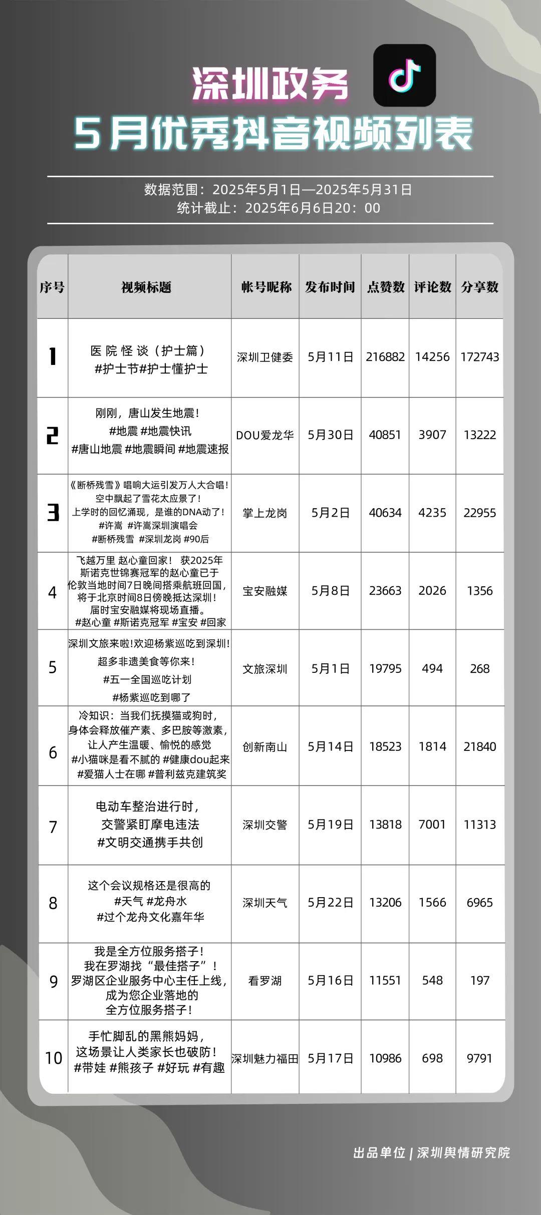5月,“深圳衛(wèi)健委”“DOU愛龍華”“掌上龍崗”“深圳天氣”“創(chuàng)新南山”“深圳交警”“深圳魅力福田”“寶安融媒”“深汕發(fā)布”“文旅深圳”共10個政務抖音號獲得“優(yōu)秀政務抖音號”稱號。5月,“深圳衛(wèi)健委”憑借3條極具創(chuàng)意的視頻內(nèi)容持續(xù)收獲網(wǎng)民關注,穩(wěn)居榜首之位,成為政務抖音號領域的標桿。“DOU愛龍華”“掌上龍崗”較上個月排名大幅度上升,以96.77分和95.81分位居榜單第2、3名,彰顯出積極探索創(chuàng)新傳播路徑、開拓政務短視頻發(fā)展新可能的決心。以上優(yōu)秀政務抖音號通過多樣化的短視頻形式傳遞政務資訊,為深圳政務新媒體在短視頻領域的蓬勃發(fā)展注入強勁動能,成為政務信息傳播的新標桿。