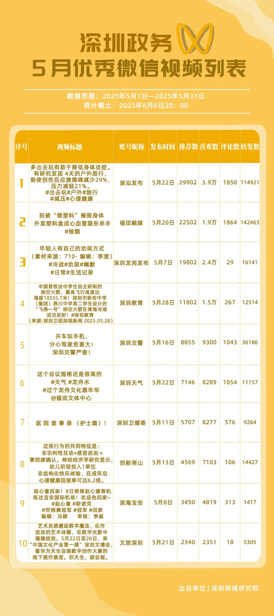 5月,獲得“深圳優(yōu)秀政務微信視頻號”稱號的是“深汕發(fā)布”“福田融媒”“深圳龍崗發(fā)布”“創(chuàng)新南山”“深圳交警”“深圳衛(wèi)健委”“深圳天氣”“深圳教育”“濱海寶安”“青春深圳”。其中,“深汕發(fā)布”保持了熱點內(nèi)容輸出的穩(wěn)定性和時效性,延續(xù)了上個月的優(yōu)異表現(xiàn)。“福田融媒”“深圳龍崗發(fā)布”排名緊隨其后,其中“深圳龍崗發(fā)布”在互動指數(shù)方面獲得滿分,搭建了高效的政民互動橋梁。這些優(yōu)秀的政務微信視頻號以各自的優(yōu)勢,展現(xiàn)出深圳政務新媒體矩陣在視頻傳播賽道的蓬勃活力,為政務信息傳播開辟更親民和高效的賽道。