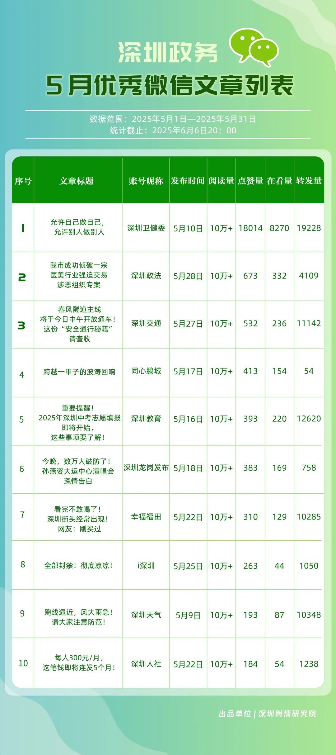 5月,30個政務微信公眾號入選“深圳優(yōu)秀政務微信公眾號”榜單,其中包括“深圳衛(wèi)健委”“幸福福田”“深圳龍崗發(fā)布”“創(chuàng)新南山”“青春深圳”“i深圳”“深圳交通”“深圳教育”“深圳工會”“深圳光明”等。其中,“深圳衛(wèi)健委”在活躍、互動、傳播3項指標上獲得滿分,其亮眼數(shù)據(jù)彰顯了內(nèi)容創(chuàng)作的高質量,位居榜單首位?!靶腋8L铩蓖瑯颖憩F(xiàn)出色,排名較上個月有所上升,以總分90.42的優(yōu)異成績位居榜單第2名;“深圳龍崗發(fā)布”“創(chuàng)新南山”“青春深圳”緊隨其后,以新穎的互動形式吸引用戶參與,表現(xiàn)值得肯定。上榜賬號充分發(fā)揮微信公眾平臺的傳播優(yōu)勢,以豐富多元的內(nèi)容形態(tài)、生動鮮活的表達風格,持續(xù)為市民提供優(yōu)質的信息服務。