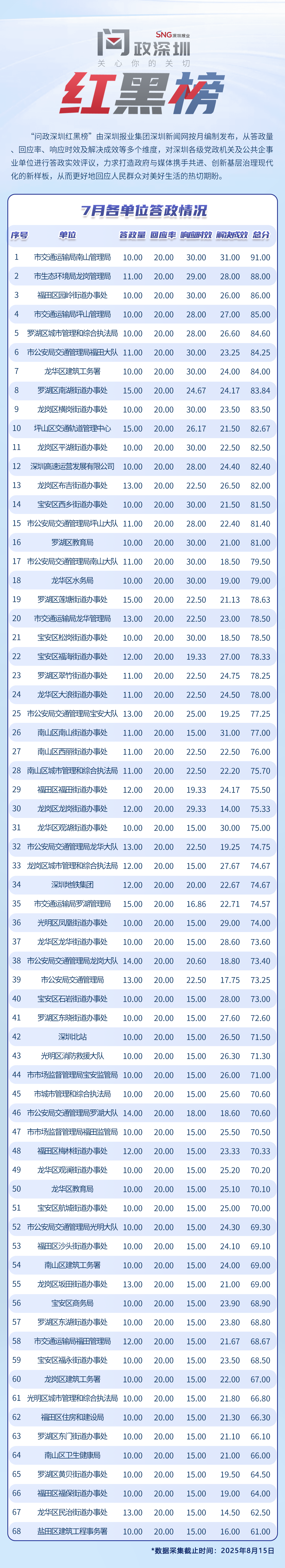 為探尋媒體如何精準(zhǔn)賦能基層治理現(xiàn)代化的“深圳路徑”,近日,深圳報(bào)業(yè)集團(tuán)正式掛牌成立“問政深圳”工作室,旨在進(jìn)一步推動網(wǎng)絡(luò)問政工作的高效開展。為確保相關(guān)工作更加契合實(shí)際需求,深圳報(bào)業(yè)集團(tuán)深圳新聞網(wǎng)按照“最快速度辦結(jié)”的總體要求,將原有月度榜單創(chuàng)新升級為“問政深圳紅黑榜”,并對評分體系進(jìn)行了細(xì)致優(yōu)化。該榜單從答政量、回應(yīng)率、響應(yīng)時(shí)效及解決成效等多個(gè)維度,對深圳各級黨政機(jī)關(guān)及公共企事業(yè)單位進(jìn)行答政實(shí)效評議,力求打造政府與媒體攜手共進(jìn)、創(chuàng)新基層治理現(xiàn)代化的新樣板,從而更好地回應(yīng)人民群眾對美好生活的熱切期盼。