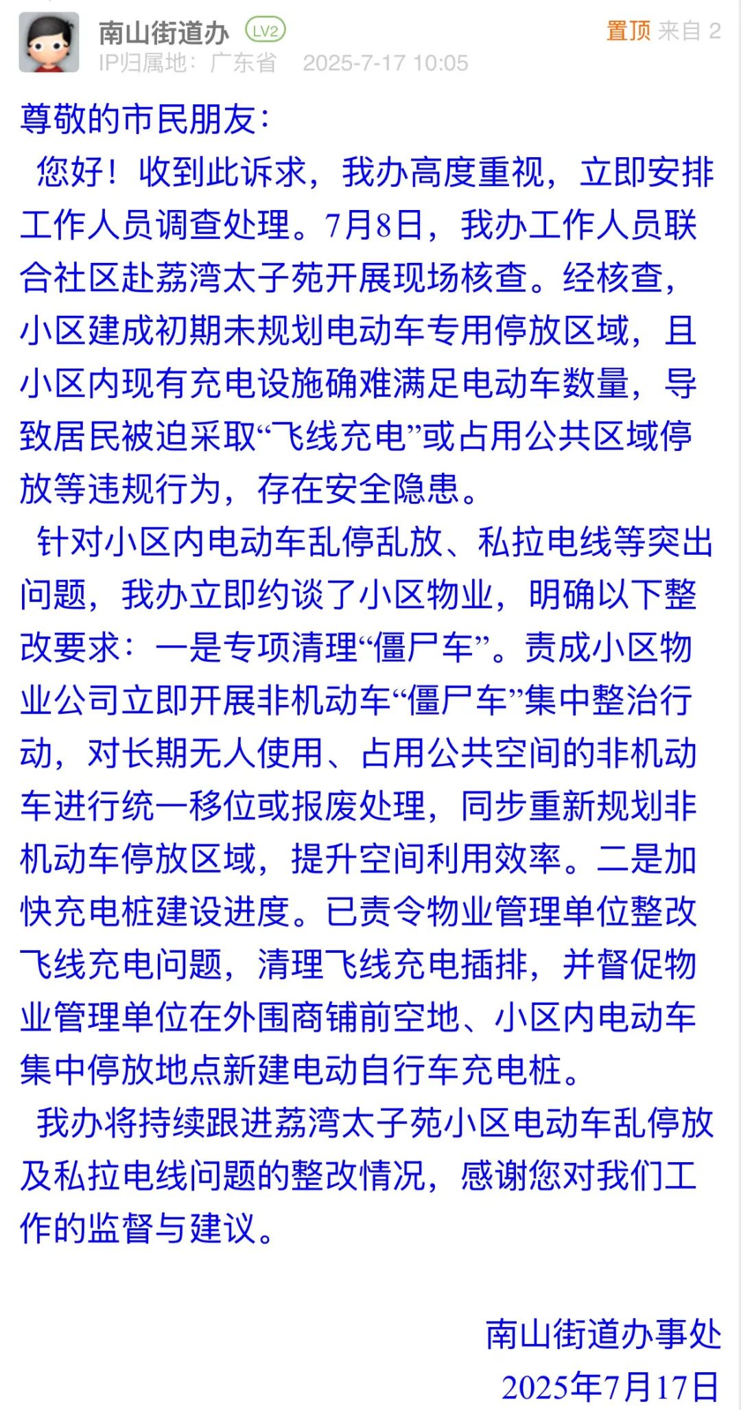 針對小區(qū)內(nèi)電動車亂停放、私拉電線等存在安全隱患的行為,南山街道辦接訴后迅速聯(lián)合社區(qū)核查,說明了歷史規(guī)劃不足的核心病因,通過約談物業(yè)推動整改,從“應(yīng)急響應(yīng)”到“系統(tǒng)治理”的務(wù)實(shí)舉措,回應(yīng)了市民對消防通道暢通、用電安全的關(guān)切,以“標(biāo)本兼治”的治理思路,為老舊小區(qū)電動車管理提供了可復(fù)制的解決方案。