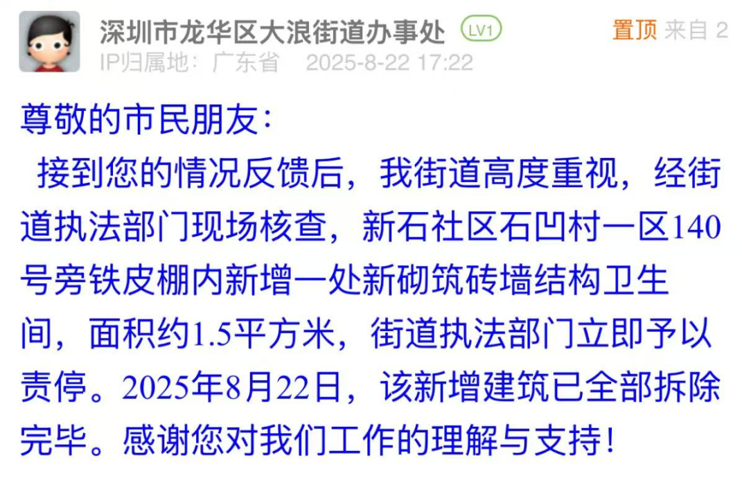 案例點評:8月21日晚間,市民發(fā)布帖文反映違建問題,大浪街道以“雷霆處置”展現(xiàn)安全至上的治理擔當。接到投訴后,街道迅速核查,在22日給出回應,表示已完成拆除工作,做到了“速辦速結,質效雙優(yōu)”。此次響應既體現(xiàn)“隱患即事故”的底線思維,更以“發(fā)現(xiàn)即拆除”的高效行動,彰顯基層治理對民生安全的敏銳感知與果斷處置能力,切實筑牢居民“身邊安全”防線。