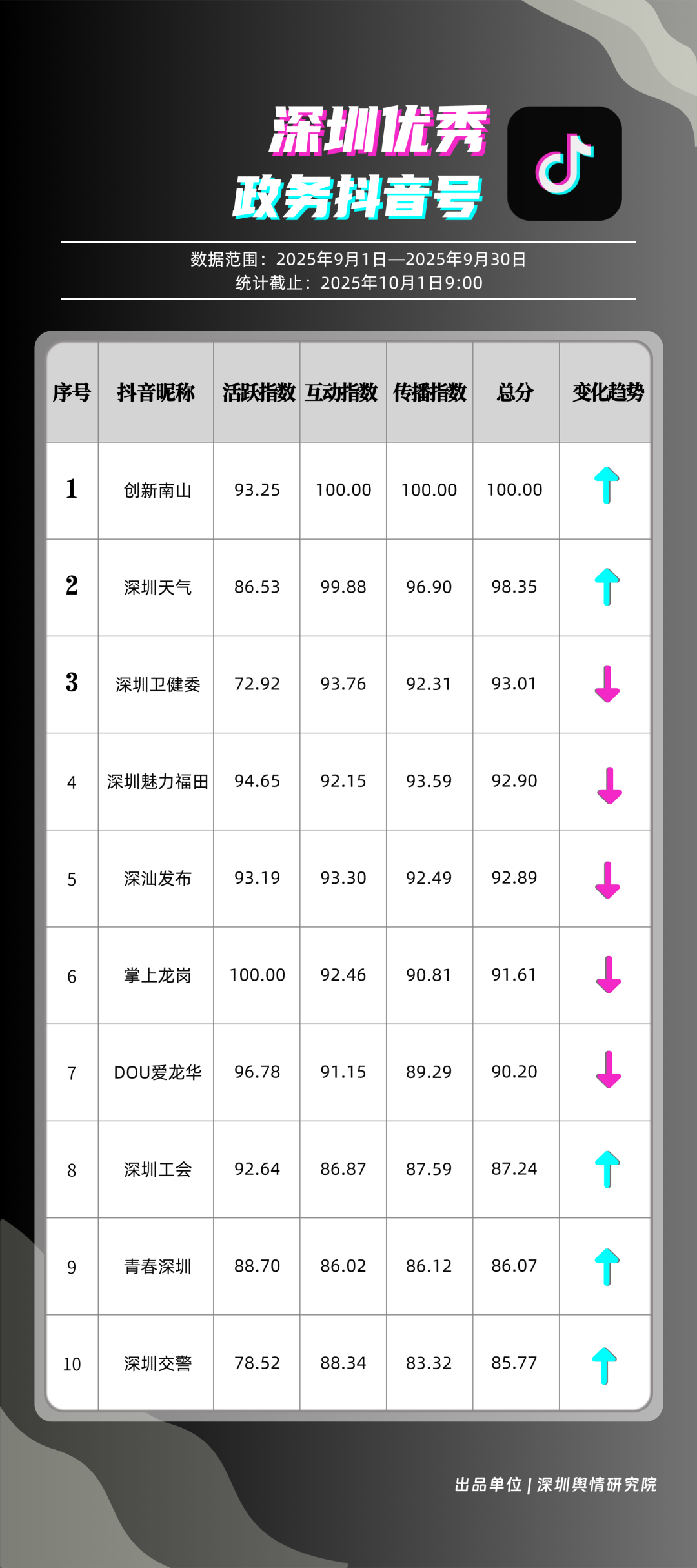 9月,獲得“優(yōu)秀政務(wù)抖音號”稱號的是“創(chuàng)新南山”“深圳天氣”“深圳衛(wèi)健委”“深圳魅力福田”“深汕發(fā)布”“掌上龍崗”“DOU愛龍華”“深圳工會”“青春深圳”“深圳交警”?!皠?chuàng)新南山”以一條有關(guān)“青春不被年齡限定”的視頻獲得超34萬次轉(zhuǎn)發(fā),超14萬次點(diǎn)贊,助力其在抖音榜單居于榜首;“深圳天氣”多條臺風(fēng)相關(guān)視頻吸引大量網(wǎng)民關(guān)注、互動,在抖音平臺得分超98分;“深圳衛(wèi)健委”“深圳魅力福田”“深汕發(fā)布”等賬號緊隨其后,得分均在92分以上。上榜的優(yōu)秀政務(wù)抖音號以“有溫度”的敘事表達(dá),將宣傳、服務(wù)內(nèi)容轉(zhuǎn)化為網(wǎng)民喜聞樂見的視頻,收獲高點(diǎn)贊、高轉(zhuǎn)發(fā)的流量實(shí)績,更在評論區(qū)形成了良性互動生態(tài),深度運(yùn)營收獲了較好成果。