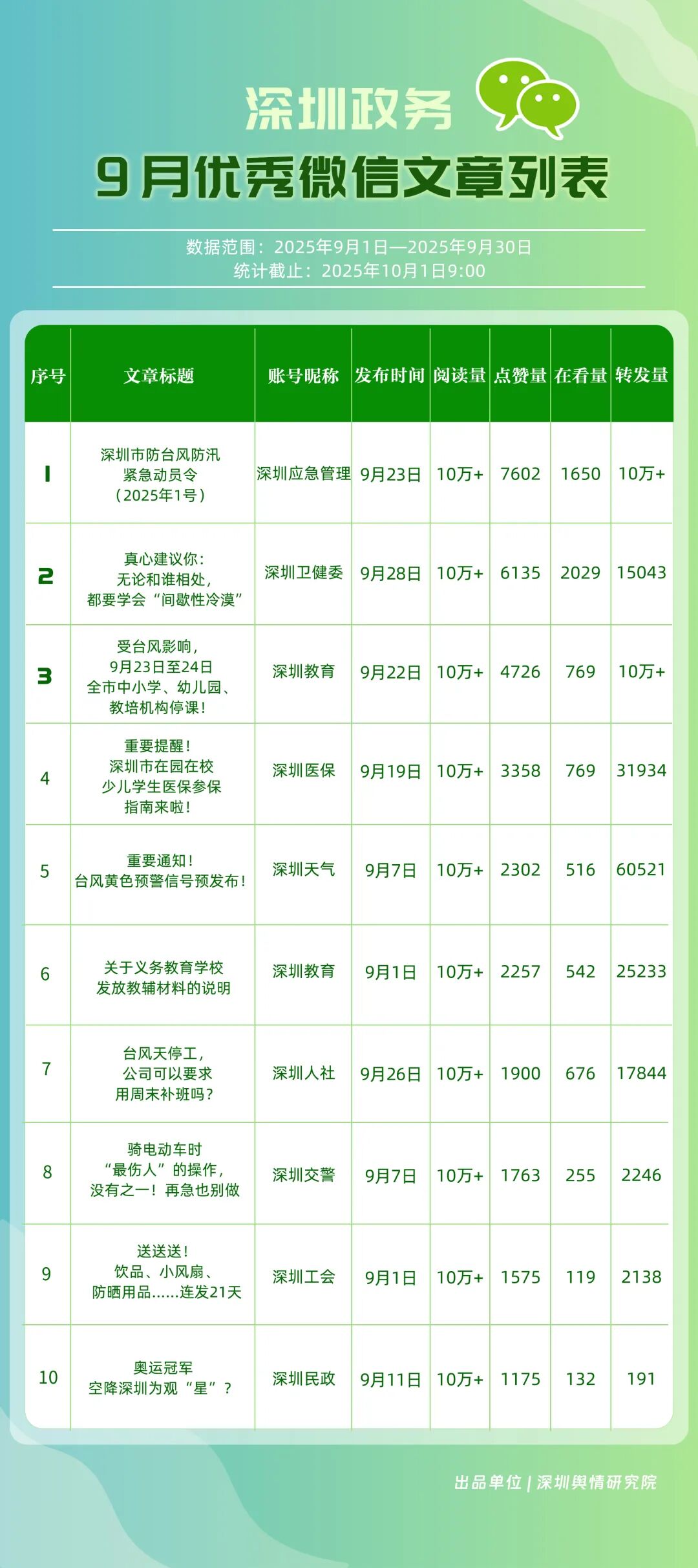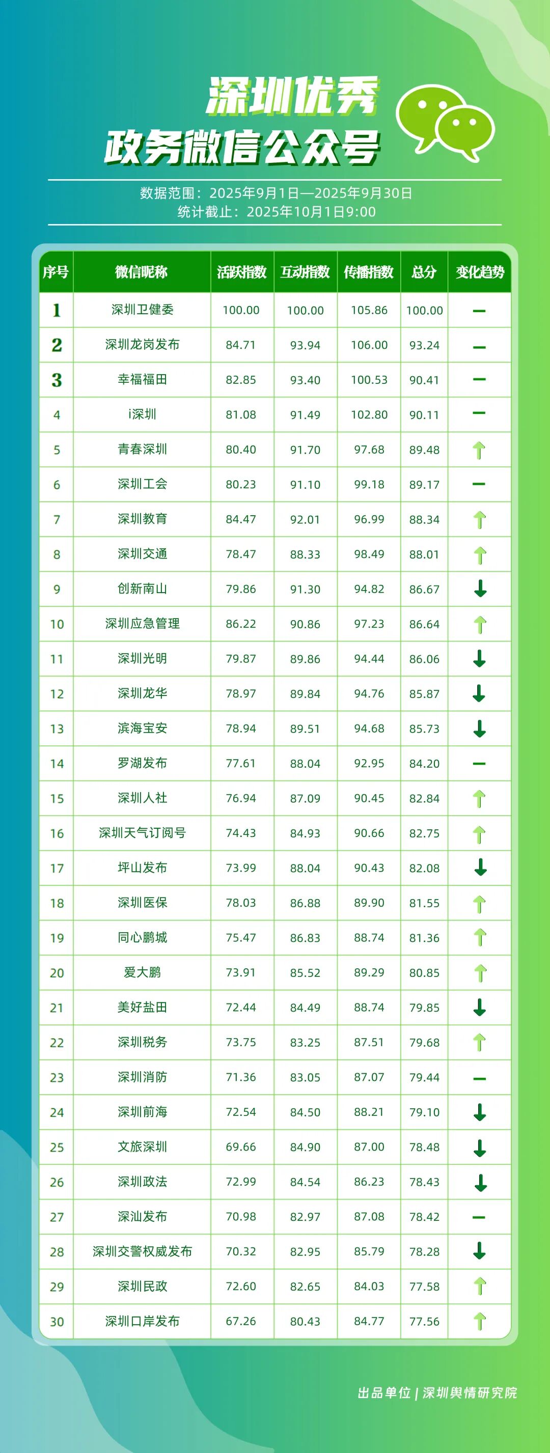 9月,“深圳衛(wèi)健委”“深圳龍崗發(fā)布”“幸福福田”“i深圳”“青春深圳”“深圳工會”“深圳教育”“深圳交通”“創(chuàng)新南山”“深圳應(yīng)急管理”等30個政務(wù)微信公眾號榮登“深圳優(yōu)秀政務(wù)微信公眾號”榜單。9月,“深圳衛(wèi)健委”以總分100.00的成績蟬聯(lián)榜單首位,其憑借突破常規(guī)視角的選題,解讀專業(yè)健康知識,引發(fā)大量網(wǎng)民共鳴,內(nèi)容質(zhì)量與傳播力形成雙向賦能;“深圳龍崗發(fā)布”以總分93.24位居第二,聚焦區(qū)域民生服務(wù)升級等動態(tài),信息觸達(dá)率不斷提升;“幸福福田”圍繞商圈經(jīng)濟(jì)復(fù)蘇、文化節(jié)慶活動等主題開展系列宣傳,增強(qiáng)區(qū)域活力展示,位列第三;“i深圳”“青春深圳”“深圳工會”等也持續(xù)優(yōu)化賬號內(nèi)容,通過實(shí)用信息推送強(qiáng)化政務(wù)服務(wù)定位。