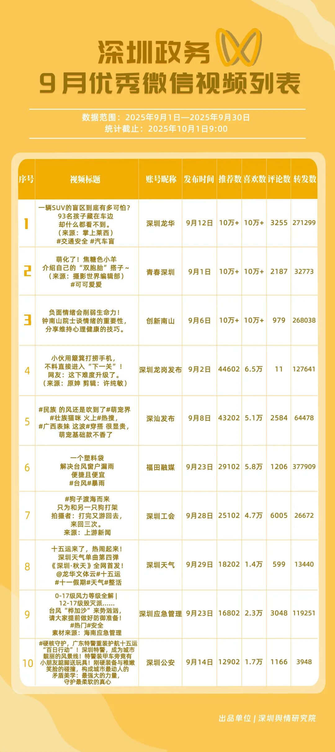 9月,深圳政務(wù)新媒體矩陣持續(xù)優(yōu)化內(nèi)容生態(tài),各單位依托平臺特色深化服務(wù)效能,南山區(qū)、市衛(wèi)生健康委員會、市氣象局(臺)、龍崗區(qū)、福田區(qū)、龍華區(qū)、深汕特別合作區(qū)、市應(yīng)急管理局、中國共產(chǎn)主義青年團(tuán)深圳市委員會、光明區(qū)的新媒體矩陣入選“深圳優(yōu)秀政務(wù)新媒體矩陣”榜單。9月,南山區(qū)在短視頻平臺表現(xiàn)突出,抖音、微信視頻號平臺均獲滿分;市衛(wèi)生健康委員會輸出深度內(nèi)容,位列榜單第二;市氣象局(臺)新媒體矩陣居于榜單第三,在9月發(fā)布臺風(fēng)相關(guān)天氣提醒,獲得公眾廣泛關(guān)注。此外,龍崗區(qū)、福田區(qū)、龍華區(qū)、深汕特別合作區(qū)新媒體矩陣持續(xù)推出優(yōu)質(zhì)內(nèi)容,共同展現(xiàn)了深圳在塑造現(xiàn)代化形象、提升數(shù)字治理能力上的創(chuàng)新引領(lǐng)作用。