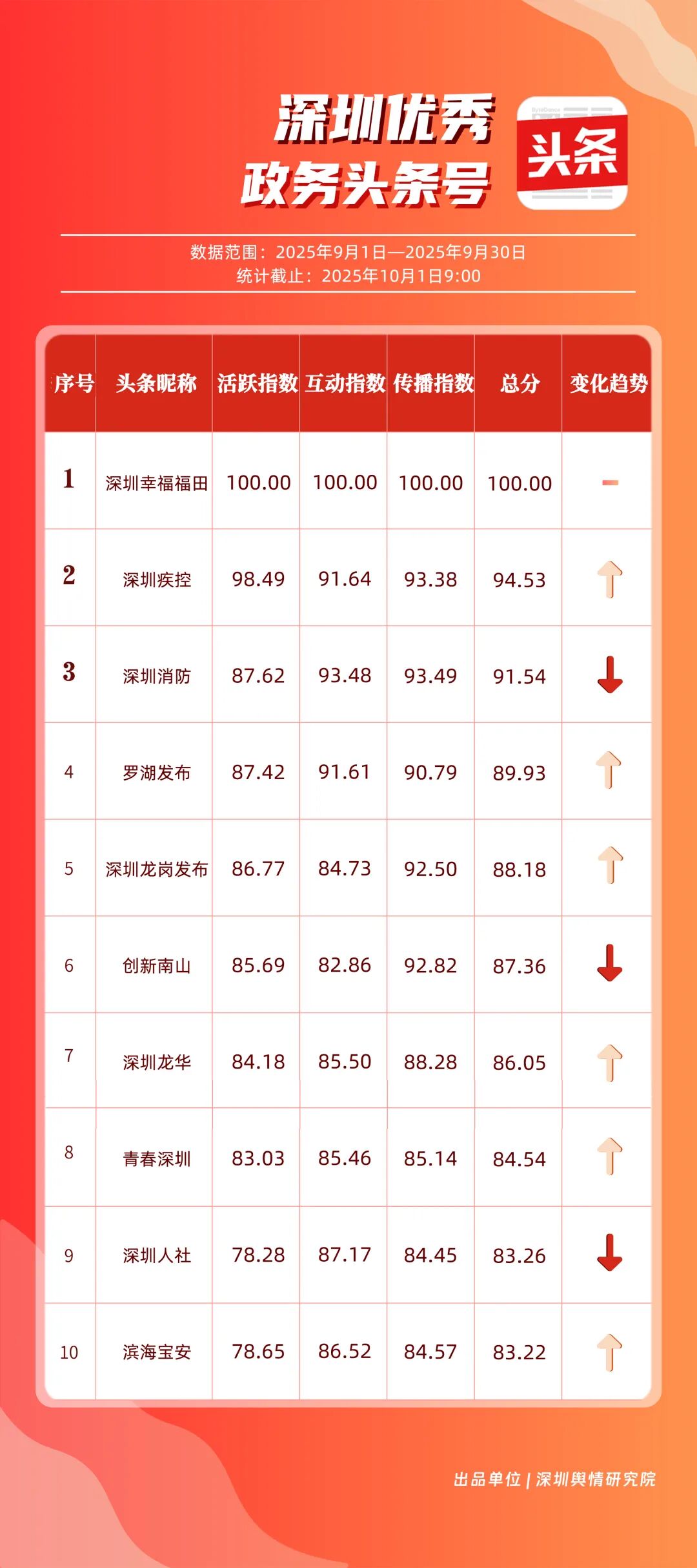 9月,“深圳幸福福田”“深圳疾控”“深圳消防”“羅湖發(fā)布”“深圳龍崗發(fā)布”“創(chuàng)新南山”“深圳龍華”“青春深圳”“深圳人社”“濱海寶安”共10個政務(wù)頭條號入選“優(yōu)秀政務(wù)頭條號”榜單?!吧钲谛腋8L铩狈€(wěn)居榜單首位,在傳播、互動等方面均表現(xiàn)卓越;“深圳疾控”關(guān)注民生健康,有關(guān)“喝茶的好處”“非正規(guī)醫(yī)美針風(fēng)險(xiǎn)”兩篇文章閱讀均超10萬次,為市民提供健康信息;“深圳消防”聚焦消防安全領(lǐng)域,提醒市民注意安全。相關(guān)上榜賬號表現(xiàn)優(yōu)異,注重內(nèi)容實(shí)用化、互動場景化,彰顯了政務(wù)新媒體的服務(wù)效能。