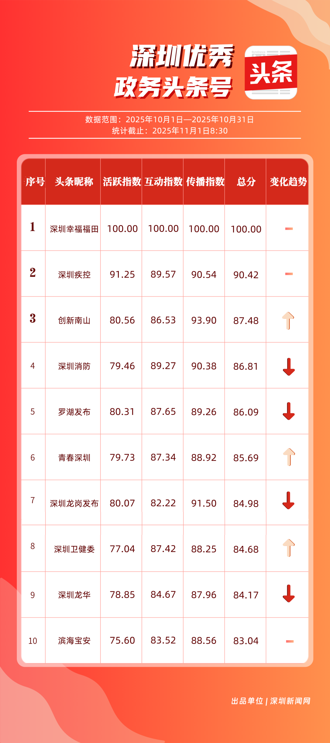 10月,“深圳幸福福田”“深圳疾控”“創(chuàng)新南山”“深圳消防”“羅湖發(fā)布”“青春深圳”“深圳龍崗發(fā)布”“深圳衛(wèi)健委”“深圳龍華”“濱海寶安”共10個(gè)政務(wù)頭條號(hào)入選“優(yōu)秀政務(wù)頭條號(hào)”榜單?!吧钲谛腋8L铩痹诨钴S、互動(dòng)、傳播均收獲較好成果,蟬聯(lián)榜首;“深圳疾控”得分超90分,持續(xù)發(fā)布民生健康類內(nèi)容,為市民健康保駕護(hù)航;“創(chuàng)新南山”內(nèi)容創(chuàng)作緊扣民生與區(qū)域特色,位列榜單第三名?!吧钲谙馈薄傲_湖發(fā)布”等賬號(hào)也位列榜單前列,成為區(qū)域政務(wù)新媒體內(nèi)容創(chuàng)新、信息傳遞的標(biāo)桿。
