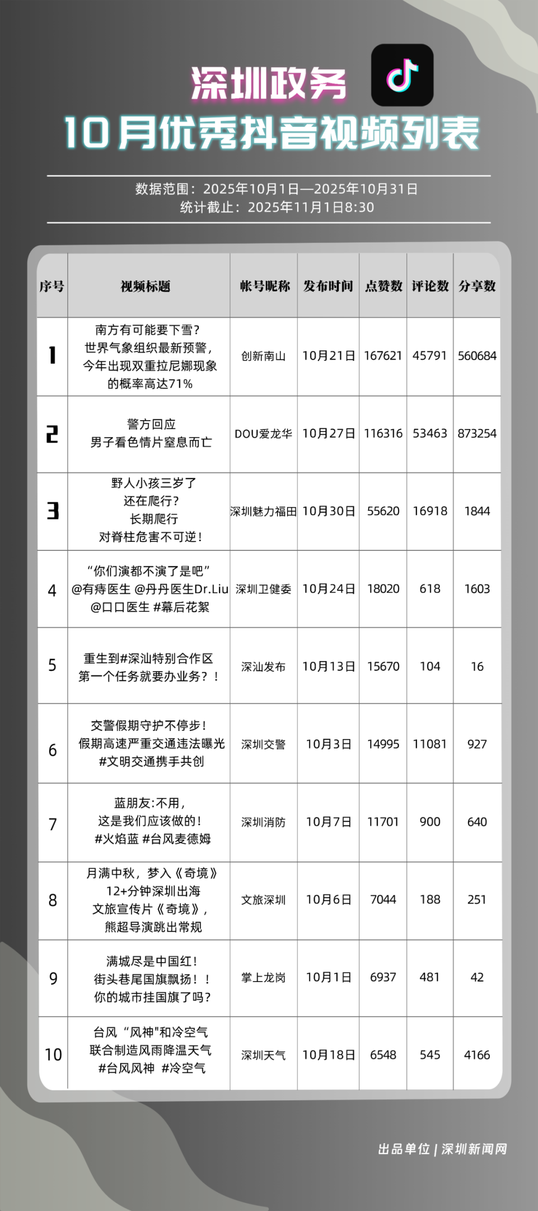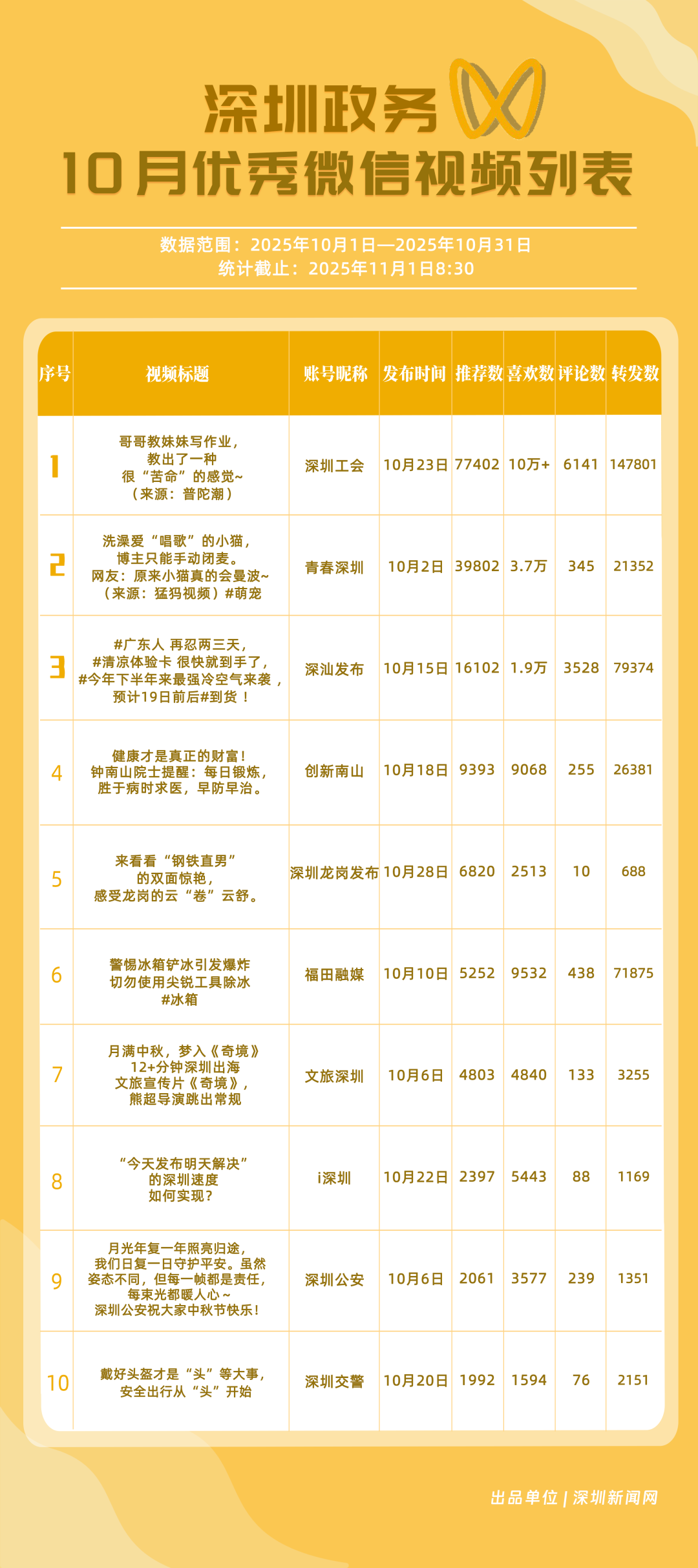 2025年10月期《深圳優(yōu)秀政務(wù)新媒體矩陣》正式發(fā)布,上榜矩陣以深度創(chuàng)新的傳播思路與精細(xì)化的服務(wù)持續(xù)領(lǐng)跑,為政務(wù)新媒體行業(yè)貢獻(xiàn)了可復(fù)制的實(shí)踐經(jīng)驗(yàn),深化政務(wù)信息與公眾喜好的精準(zhǔn)對(duì)接,為深圳政務(wù)新媒體高質(zhì)量發(fā)展注入新動(dòng)能與新活力。