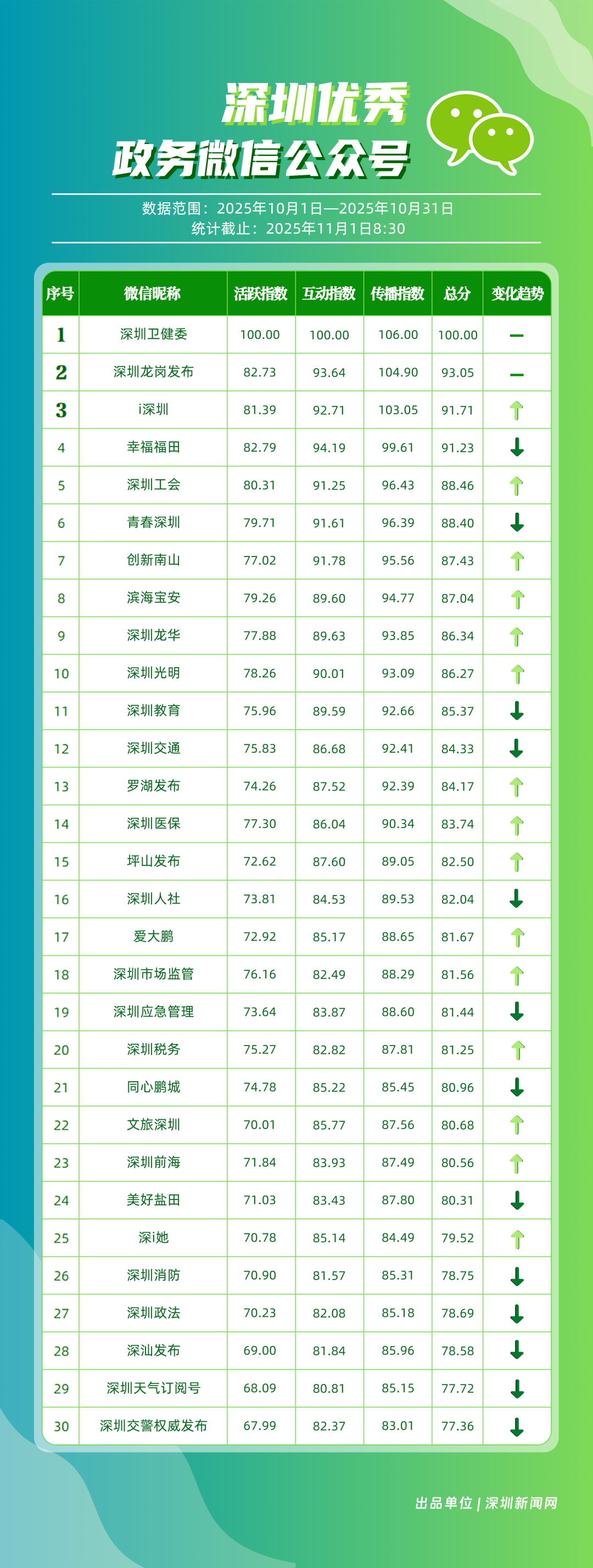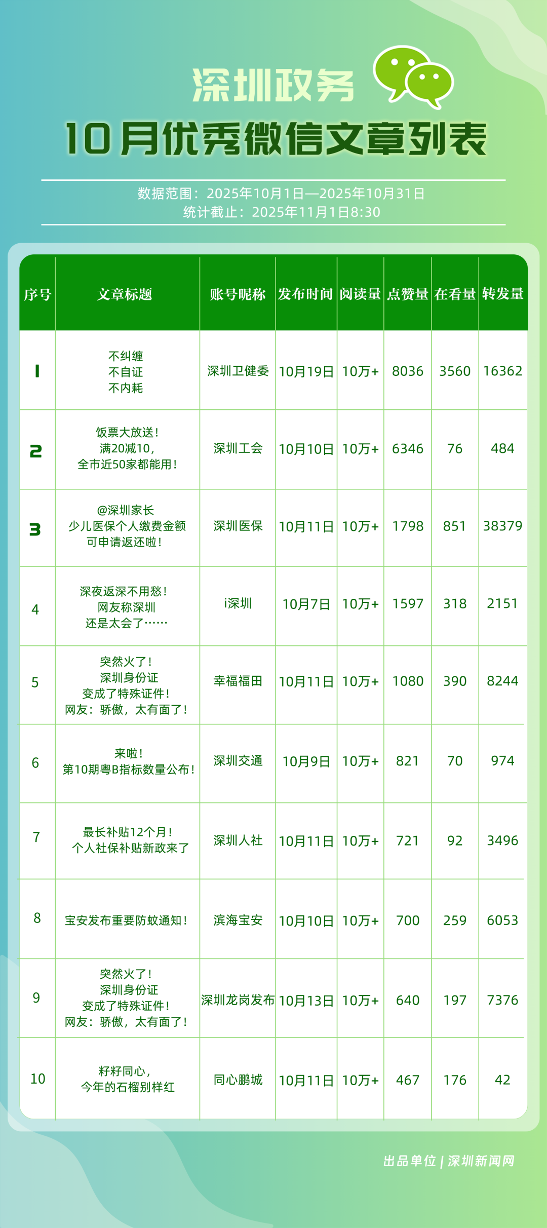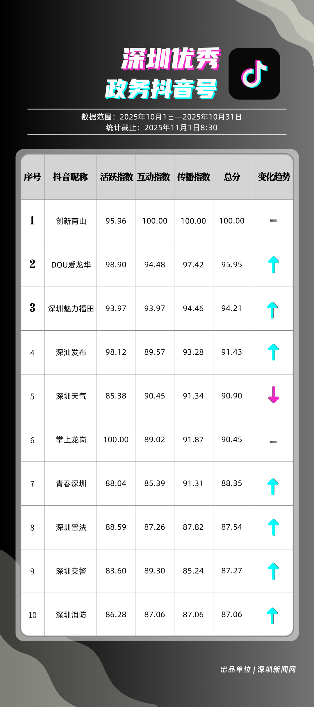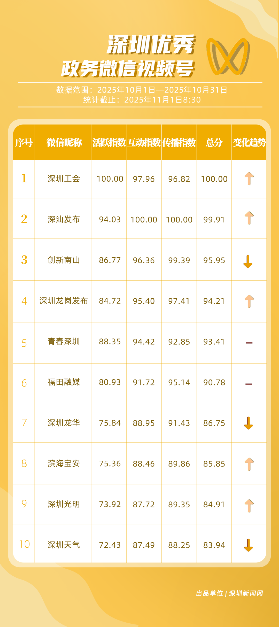 10月“深圳優(yōu)秀政務(wù)新媒體矩陣”榜單揭曉,這6個(gè)矩陣排名有上升!