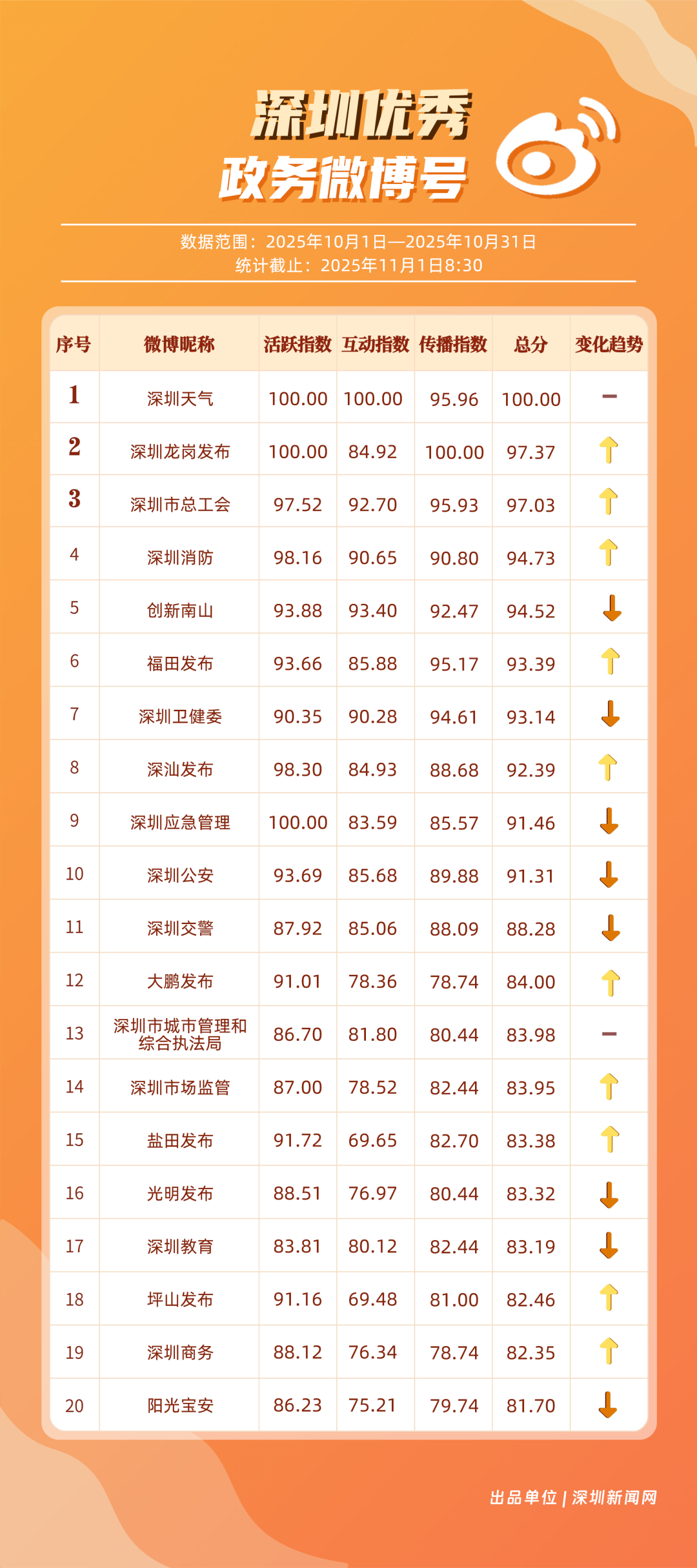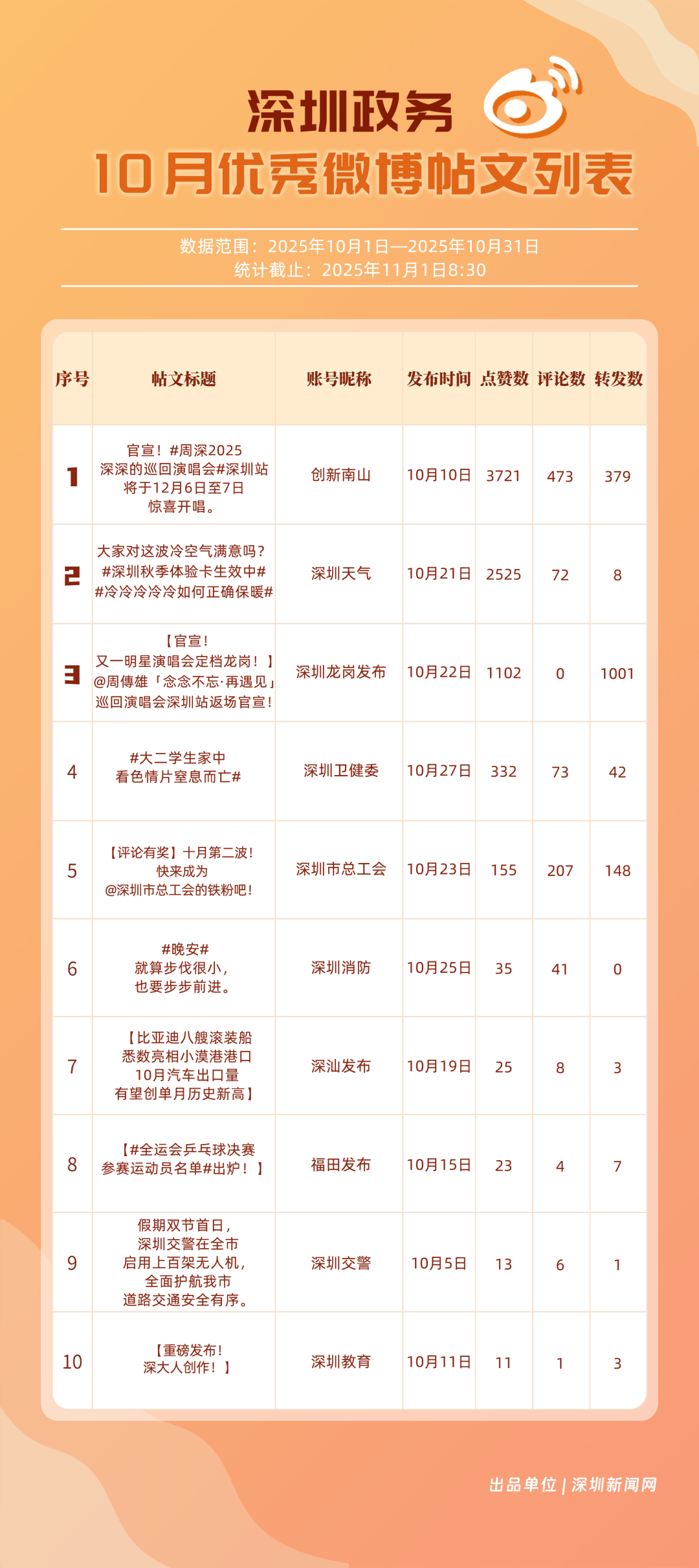 10月,20個(gè)賬號(hào)入選“優(yōu)秀政務(wù)微博號(hào)”榜單,其中包括:“深圳天氣”“深圳龍崗發(fā)布”“深圳市總工會(huì)”“深圳消防”“創(chuàng)新南山”“福田發(fā)布”“深圳衛(wèi)健委”“深汕發(fā)布”“深圳應(yīng)急管理”“深圳公安”等。其中,“深圳天氣”高頻、及時(shí)地發(fā)布天氣相關(guān)內(nèi)容,其中多篇關(guān)于“冷空氣”“入秋”帖文收獲較好互動(dòng)和傳播效果,以100分位列榜單首位;“深圳龍崗發(fā)布”總分97.37分,居于榜單第二,其有關(guān)演唱會(huì)定檔、卷尺哥等內(nèi)容的帖文獲得較好數(shù)據(jù);“深圳市總工會(huì)”關(guān)注職工日常生活,以97.03分居于榜單第三?!吧钲谙馈薄皠?chuàng)新南山”等微博賬號(hào)也通過各自的特色內(nèi)容,展現(xiàn)深圳城市治理、民生服務(wù)的溫度。