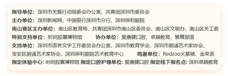 讓閱讀成為動人的風(fēng)景,讓故事的魅力感動深圳。為助力建設(shè)良好的青少年閱讀環(huán)境,激發(fā)學(xué)生閱讀興趣,倡導(dǎo)親子閱讀,共建和諧家庭關(guān)系。2020年,第二十一屆深圳讀書月主題活動“誰是故事大王·第四季”在共青團(tuán)深圳市委員會、深圳市關(guān)愛行動組委會辦公室的指導(dǎo)下再出發(fā)。更長的活動周期,更豐富的參與形式,更專業(yè)的賽制,“誰是故事大王·第四季”等你來解鎖與挑戰(zhàn)!